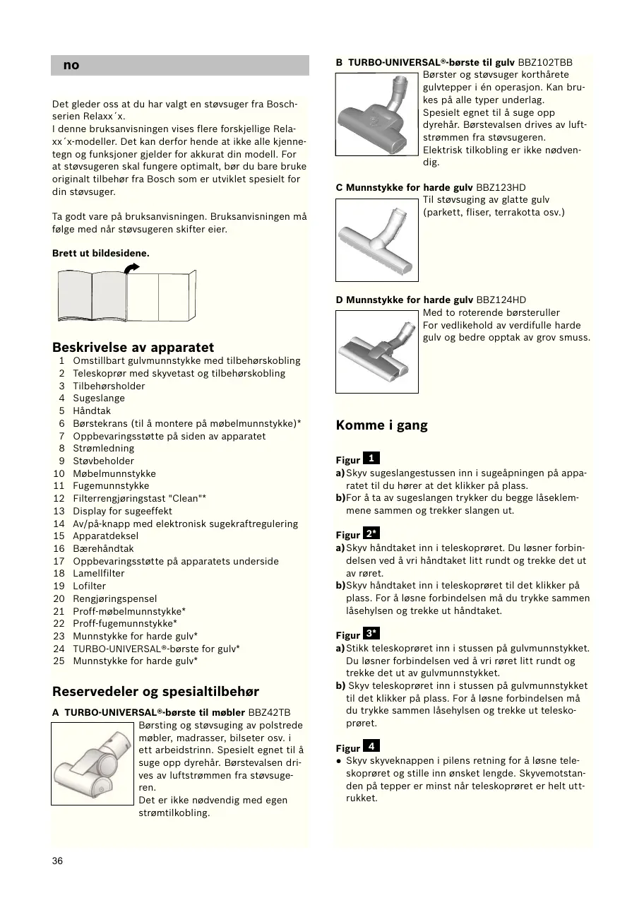 Det gleder oss at du har valgt en støvsuger fra Boschserien Relaxx´x. I denne bruksanvisningen vises flere forskjellige Relaxx´x-modeller. Det kan derfor hende at ikke alle kjennetegn og funksjoner gjelder for akkurat din modell. For at støvsugeren skal fungere optimalt, bør du bare bruke originalt tilbehør fra Bosch som er utviklet spesielt for din støvsuger. Ta godt vare på bruksanvisningen. Bruksanvisningen må følge med når støvsugeren skifter eier. B TURBO-UNIVERSAL®-børste til gulv BBZ102TBB Børster og støvsuger korthårete gulvtepper i én operasjon. Kan brukes på alle typer underlag. Spesielt egnet til å suge opp dyrehår. Børstevalsen drives av luftstrømmen fra støvsugeren. Elektrisk tilkobling er ikke nødvendig. C Munnstykke for harde gulv BBZ123HD Til støvsuging av glatte gulv (parkett, fliser, terrakotta osv.) Brett ut bildesidene. Beskrivelse av apparatet