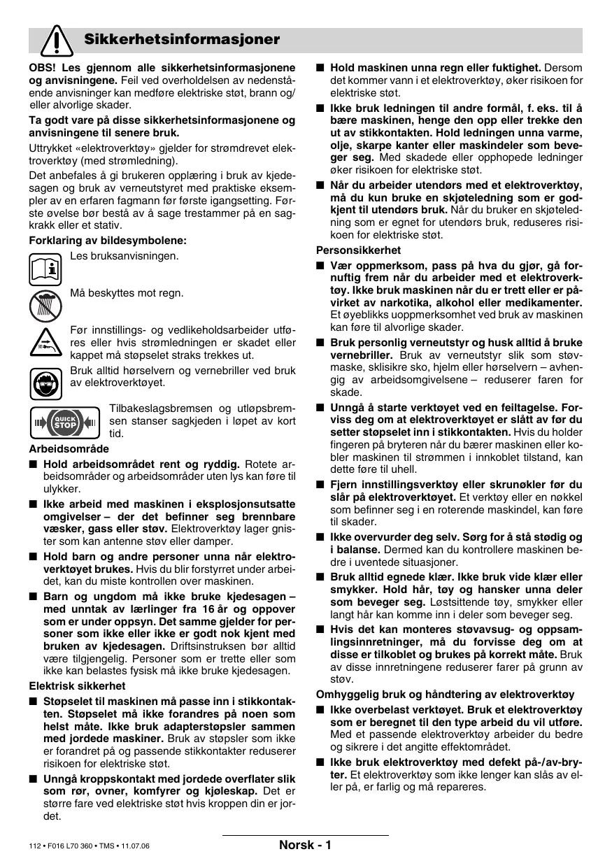 Prova di omologazione num. 2088141.01 CE attraverso stazione di collaudo notificata num. 0344. CE 2000/14: Il livello della potenza sonora L WA garantito è minore di 104 dB (A). Procedimento di valutazione della conformità secondo appendice V. Leinfelden, 01.09.2005. Dr. Egbert Schneider Als u de machine wilt uitschakelen, laat u de aan/ uit-schakelaar 2 los. Na het zagen mag de kettingzaag niet worden gestopt door het bedienen van de voorste handbescherming (activeren van de terugslagrem).