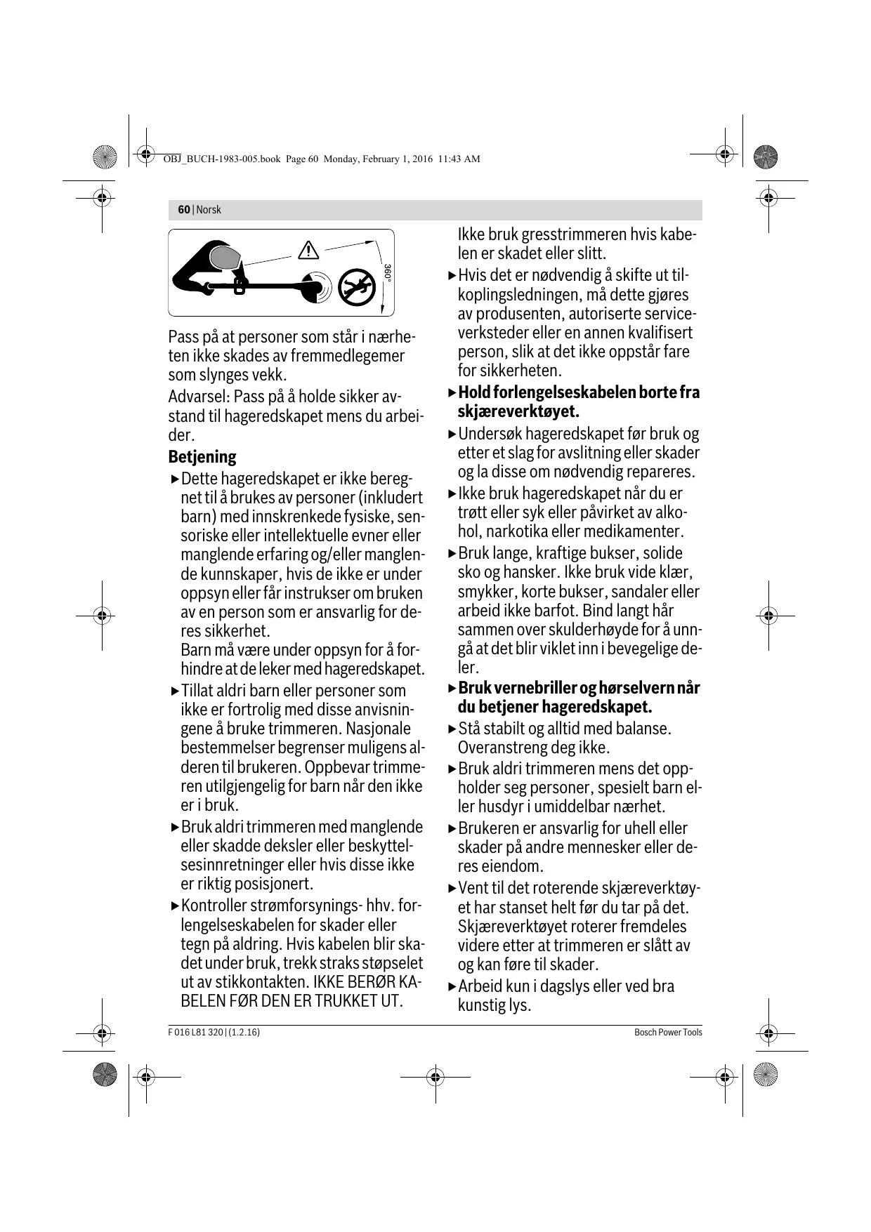 - 2,6 2,8 2,7 2,9 2,8 3,0 /II /II /II /II /II /II Beskyttelsesklasse Serienummer se typeskiltet på hageredskapet Informasjonene gjelder for nominell spenning [U] på 230 V. Ved avvikende spenning og på visse nasjonale modeller kan disse informasjonene variere noe. F 016 L81 320 | (1.2.16) Bosch Power Tools OBJ_BUCH-1983-005.book Page 63 Monday, February 1, 2016 11:43 AM Norsk | 63 Støy-/vibrasjonsinformasjon 3 600 HA5 8 p. 3