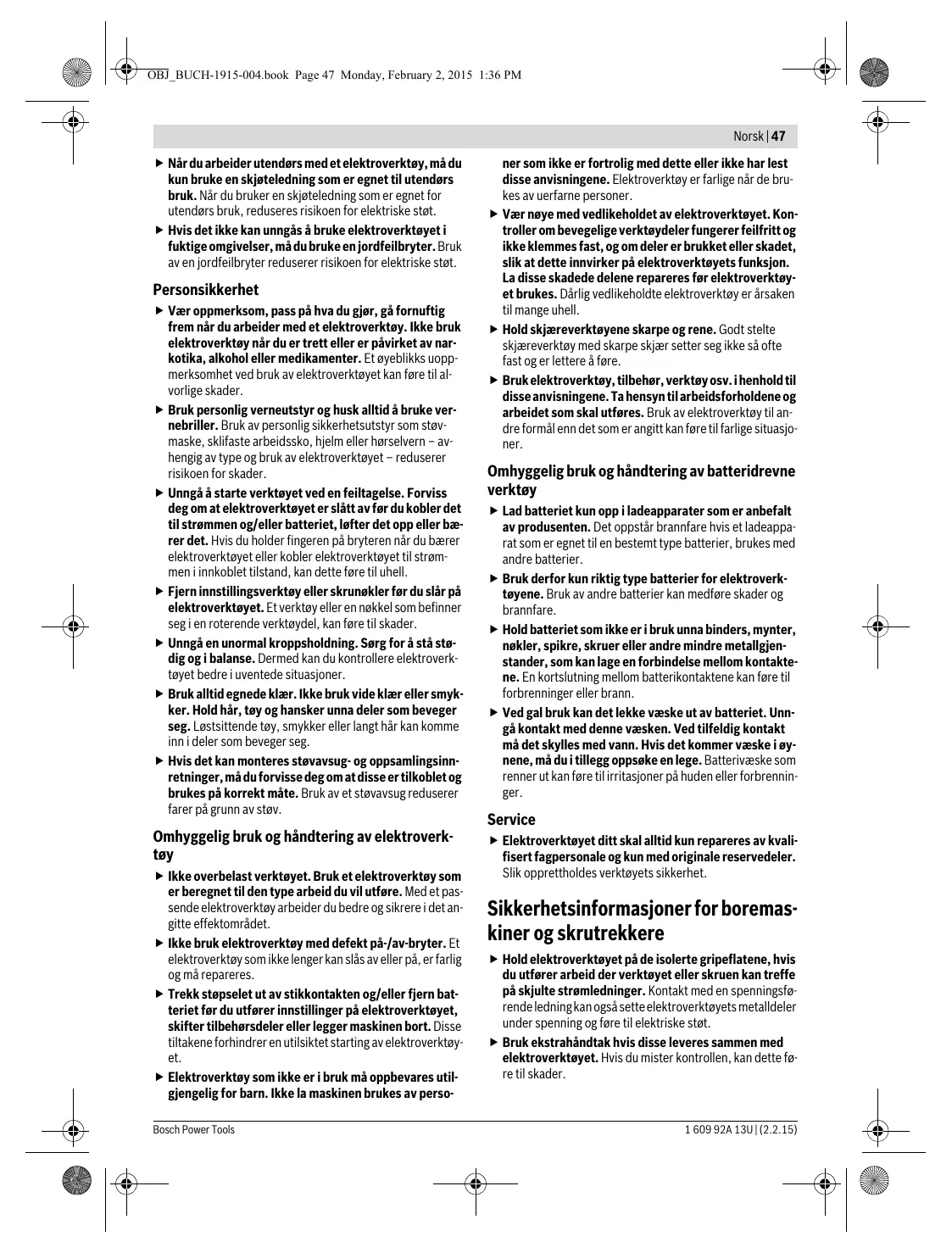 1 609 92A 13U | (2.2.15) OBJ_BUCH-1915-004.book Page 50 Monday, February 2, 2015 1:36 PM 50 | Norsk Støy-/vibrasjonsinformasjon Måleverdiene til produktet er angitt i tabellen på side 71. Støyutslippsverdier målt i henhold til EN 60745-2-1. Totale svingningsverdier ah (vektorsum fra tre retninger) og usikkerhet K beregnet jf. EN 60745. Vibrasjonsnivået som er angitt i disse anvisningene, er målt iht. en målemetode som er standardisert i EN 60745 og kan brukes til sammenligning av elektroverktøy med hverandre. Det egner seg også til en foreløpig vurdering av vibrasjonsbelastningen. Det angitte vibrasjonsnivået representerer de hovedsakelige anvendelsene til elektroverktøyet. Men hvis elektroverktøyet brukes til andre anvendelser, med forskjellig tilbehør eller utilstrekkelig vedlikehold, kan vibrasjonsnivået avvike. Dette kan føre til en tydelig øking av vibrasjonsbelastningen over hele arbeidstidsrommet. Til en nøyaktig vurdering av vibrasjonsbelastningen skal det også tas hensyn til de tidene maskinen er slått av eller går, men ikke virkelig brukes. Dette kan tydelig redusere vibrasjonsbelastningen over hele arbeidstidsrommet. Bestem ekstra sikkerhetstiltak til beskyttelse av brukeren mot vibrasjonenes virkning, som for eksempel: Vedlikehold av elektroverktøy og innsatsverktøy, holde hendene varme, organisere arbeidsforløpene. Montering og drift Mål for aktiviteten Fjerning av batteriet Innsetting av batteriet Montering av innsatsverktøy Innstilling av rotasjonsretningen Forvalg av dreiemoment Valg av borestilling Inn-/utkopling Valg av tilbehør Norsk Robert Bosch AS Postboks 350 1402 Ski Tel.: 64 87 89 50 Faks: 64 87 89 55 Transport Li-ion-batteriene i verktøyet underligger kravene for farlig gods. Batteriene kan transporteres på veier av brukeren uten ytterligere krav. Ved forsendelse gjennom tredje personer (f. eks.: lufttransport eller spedisjon) må det oppfylles spesielle krav til emballasje og merking. Du må da konsultere en ekspert for farlig gods ved forberedelse av forsendelsen. Send batterier kun hvis huset ikke er skadet. Lim igjen de åpne kontaktene og pakk batteriet slik at det ikke beveger seg i emballasjen. Ta også hensyn til eventuelle videreførende nasjonale forskrifter. Deponering Elektroverktøy, batterier, tilbehør og emballasje må leveres inn til miljøvennlig gjenvinning. Elektroverktøy og batterier må ikke kastes i vanlig søppel! Bilde