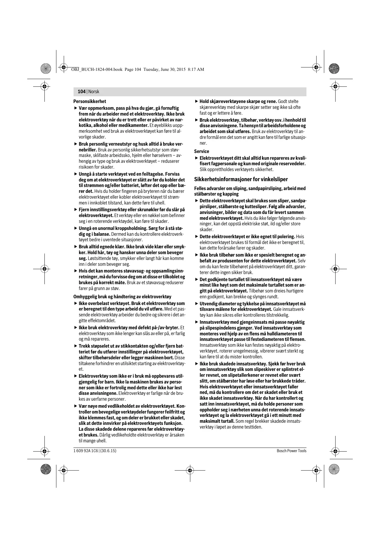 1,8 1,8 1,8 1,8 1,8 1,8 /II 1,8 /II 1,8 /II 1,8 /II 1,8 /II Informasjonene gjelder for nominell spenning [U] på 230 V. Ved avvikende spenning og på visse nasjonale modeller kan disse informasjonene variere noe. Samsvarserklæring Vi erklærer under eneansvar at produktet som er beskrevet under «Tekniske data» er i overensstemmelse med alle relevante bestemmelser i direktivene 2011/65/EU, til 19. april 2016: 2004/108/EC, fra 20. april 2016: 2014/30/EU, 2006/42/EC inkludert endringer, og følgende standarder: EN 60745-1, EN 60745-2-3. Tekniske data (2006/42/EC) hos: Robert Bosch GmbH, PT/ETM9, 70764 Leinfelden-Echterdingen, GERMANY Bosch Power Tools Henk Becker Executive Vice President Engineering Helmut Heinzelmann Head of Product Certification PT/ETM9 Robert Bosch GmbH, Power Tools Division 70764 Leinfelden-Echterdingen, GERMANY Leinfelden, 01.06.2015 1 609 92A 1C6 | (30.6.15) OBJ_BUCH-1824-004.book Page 110 Tuesday, June 30, 2015 8:17 AM 110 | Norsk Montering Montering av beskyttelsesinnretninger Før alle arbeider på elektroverktøyet utføres må støpselet trekkes ut av stikkontakten. Merk: Etter brudd på slipeskiven i løpet av driften eler skader på festeinnretningene på vernedekselet/på elektroverktøyet må elektroverktøyet straks sendes inn til kundeservice, adresser se avsnittet «Kundeservice og rådgivning ved bruk». Vernedeksel til sliping Legg vernedekselet 6 på festet på elektroverktøyet til kodeknastene til vernedekselet stemmer overens med festet. Trykk og hold samtidig fast låsespaken 1. Trykk vernedekselet 6 inn på spindelhalsen til kanten på vernedekselet ligger mot flensen til elektroverktøyet og drei vernedekselet til det hørbart går i lås. Tilpass vernedekselets 6 stilling til arbeidssituasjons krav. Trykk da låsespaken 1 oppover og drei vernedekselet 6 til ønsket posisjon. Innstill vernedekselet 6 alltid slik at alle 3 knastene på låsespaken 1 griper inn i de passende utsparingene på vernedekselet 6. Innstill vernedekselet 6 slik at gnistene ikke fyker mot brukeren. Vernedekselet 6 må kun kunne dreies når låsespaken 1 trykkes! Ellers må elektroverktøyet ikke brukes videre og må leveres inn til kundeservice. Merk: Kodeknastene på vernedekslet 6 sørger for at det kun kan monteres et passende vernedeksel på elektroverktøyet. Vernedeksel til kapping Ved kapping med bakelitt-bundede slipemidler må du alltid bruke vernedekselet 10. Ved kapping i stein må du sørge for en tilstrekkelig støvavsuging. Vernedekselet til kapping 10 monteres på samme måte som vernedekselet til sliping 6. Avsugdeksel til kapping med føringssleide Avsugdekselet til kapping med føringssleide 17 monteres på samme måte som vernedekselet til sliping 6. Ekstrahåndtak Bruk elektroverktøyet kun med ekstrahåndtaket 4. Skru ekstrahåndtaket 4 inn på høyre eller venstre side av girhodet avhengig av typen bruk. Håndbeskyttelse Til arbeid med gummislipetallerkenen 13 eller koppbørsten/skivebørsten/lamellskiven må du alltid montere håndbeskyttelsen 12. Fest håndbeskyttelsen 12 med ekstrahåndtaket 4. 1 609 92A 1C6 | (30.6.15) Montering av slipeverktøy Før alle arbeider på elektroverktøyet utføres må støpselet trekkes ut av stikkontakten. Ikke ta på slipe- og kappeskivene før de er avkjølt. Skivene blir svært varme i løpet av arbeidet. Rengjør slipespindelen 5 og alle delene som skal monteres. Til festing og løsning av slipeverktøy må spindellåsetasten 2 låses rundt slipespindelen. Trykk på spindellåsetasten kun når slipespindelen står stille. Elektroverktøyet kan ellers ta skade. Slipe-/kappeskive Ta hensyn til slipeverktøyenes dimensjoner. Hullets diameter må passe til festeflensen. Ikke bruk adaptere eller reduksjonsstykker. Ved bruk av diamant-kappeskiver må du passe på at dreieretningspilen på diamant-kappeskiven og elektroverktøyets dreieretning (se dreieretningspilen på girhodet) stemmer overens. Rekkefølgen til monteringen er angitt på bildesiden. Til festing av slipe-/kappeskiven skrur du på spennmutteren 9 og spenner denne med hakenøkkelen. Etter montering av slipeverktøyet og før innkoblingen må du sjekke om slipeverktøyet er korrekt montert og kan dreies fritt. Pass på at slipeverktøyet ikke kommer borti vernedekselet eller andre deler. Lamellslipeskive Monter alltid håndbeskyttelsen 12 til arbeid med lamellslipeskiven. Gummi-slipetallerken Til arbeid med gummislipetallerkenen 13 må du alltid montere håndbeskyttelsen 12. Rekkefølgen til monteringen er angitt på bildesiden. Skru rundmutteren 15 på og spenn denne med hakenøkkelen. Koppbørste/skivebørste Monter alltid håndbeskyttelsen 12 til arbeid med koppbørsten eller skivebørsten. Rekkefølgen til monteringen er angitt på bildesiden. Koppbørsten/skivebørsten må kunne skrus så langt inn på slipespindelen at slipespindelflensen ligger godt mot enden på slipespindelgjengen. Spenn koppbørsten/skivebørsten fast med en fastnøkkel. Godkjente slipeverktøy Det kan brukes alle slipeverktøy som er angitt i denne bruksanvisningen. Det godkjente turtallet [min-1] hhv. periferihastigheten [m/s] til anvendt slipeverktøy må minst tilsvare informasjonene i nedenstående tabell. Ta derfor hensyn til godkjent turtall hhv. periferihastighet på etiketten til slipeverktøyet. Bosch Power Tools OBJ_BUCH-1824-004.book Page 111 Tuesday, June 30, 2015 8:17 AM Norsk | 111 max. [mm]