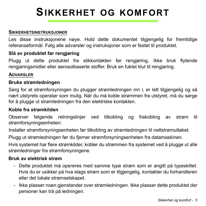 NØDANROP - Advarsel: Du kan ikke foreta nødanrop med denne enheten. Hvis du vil foreta et nødanrop, må du ringe ut via mobiltelefonen eller andre telefonsystemer. NÅR DU IKKE SKAL BRUKE PRODUKTET MER Ikke kast denne elektroniske enheten som vanlig forbrukeravfall. Sørg for resirkulering av enheten for å redusere forurensning og bidra til beskyttelse av det globale miljøet. Hvis du vil ha mer informasjon om bestemmelsene i WEEE-direktivet (Waste from Electrical and Electronics Equipment), besøk www.acer-group.com/public/Sustainability/sustainability01.htm TIPS OG INFORMASJON OM KOMFORTABEL BRUK Datamaskinbrukere kan klage over øyeplager og hodepine etter forlenget bruk. Brukere har også større fare for fysisk skade etter mange timer med arbeid foran en datamaskin. Lange arbeidsperioder, dårlig arbeidsstilling, uheldige arbeidsvaner, stress, feilaktige arbeidsforhold, personlig helse og andre faktorer øker risikoen for fysisk skade betydelig. Feilaktig datamaskinbruk kan føre til musesyke, senekjedebetennelse eller andre muskel/ skjelett-lidelser. Følgende symptomer kan oppstå i hender, håndledd, armer, skuldre, nakke eller rygg: - Nummenhet, eller en brennende eller prikkende følelse. - Verk, sårhet eller ømhet. - Smerte, oppsvulming eller pulsering. - Stivhet eller stramhet. - Kulde eller svakhet. Hvis du har disse symptomene eller annet gjentagende eller varig ubehag og/eller smerte knyttet til datamaskinbruk, kontakt en lege umiddelbart og informer bedriftshelseansvarlig. Følgende avsnitt gir tips om mer komfortabel datamaskinbruk.