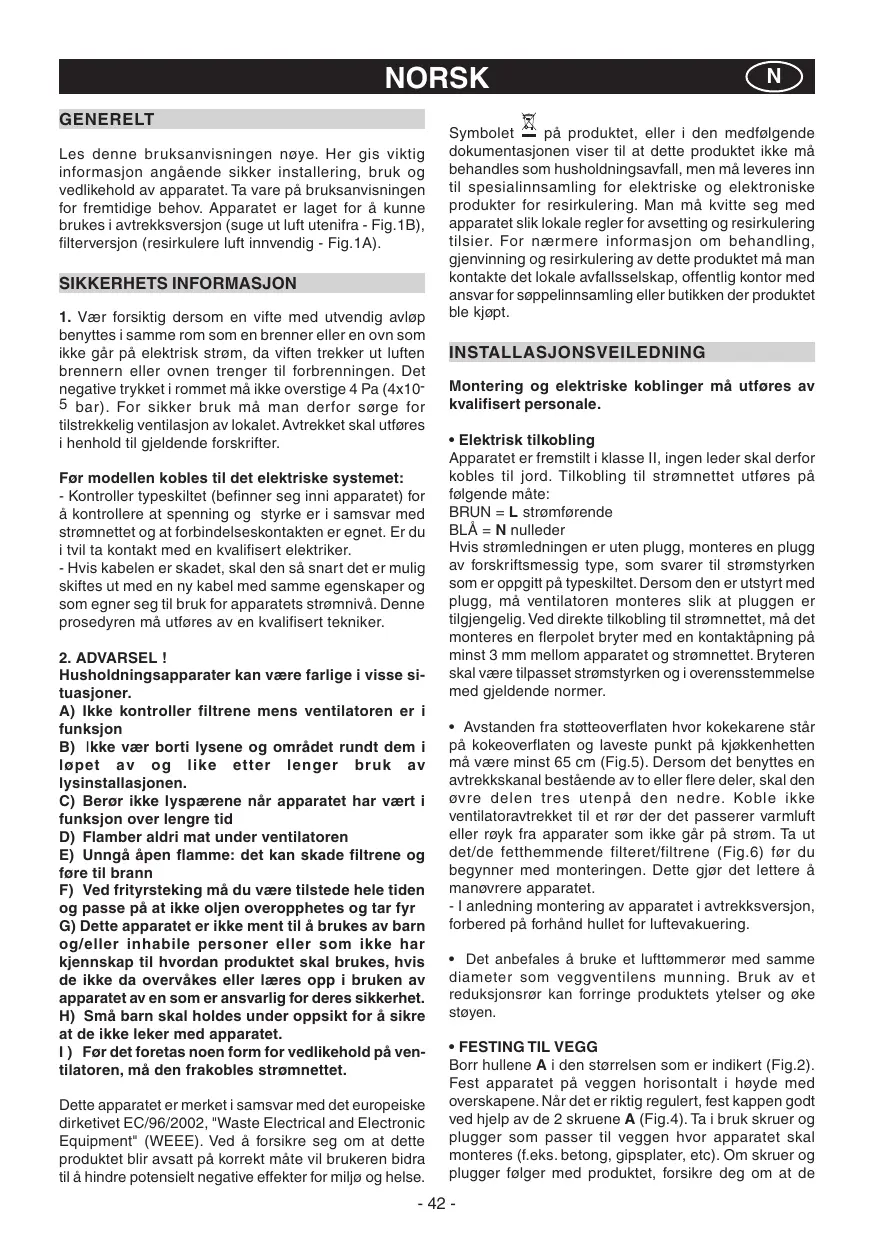 Husholdningsapparater kan være farlige i visse situasjoner. A) Ikke kontroller filtrene mens ventilatoren er i funksjon B) Ikke vær borti lysene og området rundt dem i løpet av og like etter lenger bruk av lysinstallasjonen. C) Berør ikke lyspærene når apparatet har vært i funksjon over lengre tid D) Flamber aldri mat under ventilatoren E) Unngå åpen flamme: det kan skade filtrene og føre til brann F) Ved frityrsteking må du være tilstede hele tiden og passe på at ikke oljen overopphetes og tar fyr G) Dette apparatet er ikke ment til å brukes av barn og/eller inhabile personer eller som ikke har kjennskap til hvordan produktet skal brukes, hvis de ikke da overvåkes eller læres opp i bruken av apparatet av en som er ansvarlig for deres sikkerhet. H) Små barn skal holdes under oppsikt for å sikre at de ikke leker med apparatet. I ) Før det foretas noen form for vedlikehold på ventilatoren, må den frakobles strømnettet. Dette apparatet er merket i samsvar med det europeiske dirketivet EC/96/2002, "Waste Electrical and Electronic Equipment" (WEEE). Ved å forsikre seg om at dette produktet blir avsatt på korrekt måte vil brukeren bidra til å hindre potensielt negative effekter for miljø og helse.