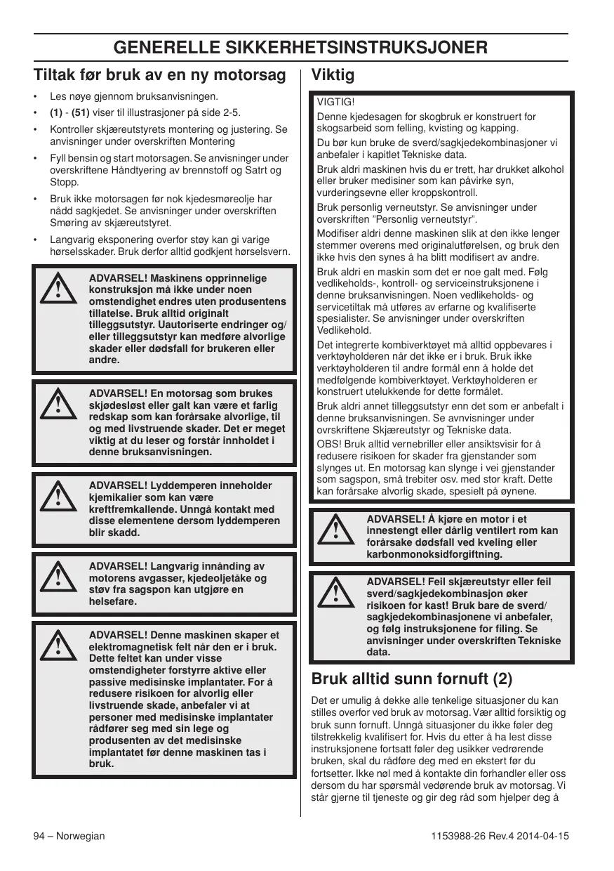 ADVARSEL! Å kjøre en motor i et innestengt eller dårlig ventilert rom kan forårsake dødsfall ved kveling eller karbonmonoksidforgiftning. ADVARSEL! Feil skjæreutstyr eller feil sverd/sagkjedekombinasjon øker risikoen for kast! Bruk bare de sverd/ sagkjedekombinasjonene vi anbefaler, og følg instruksjonene for filing. Se anvisninger under overskriften Tekniske data. Bruk alltid sunn fornuft (2) Det er umulig å dekke alle tenkelige situasjoner du kan stilles overfor ved bruk av motorsag. Vær alltid forsiktig og bruk sunn fornuft. Unngå situasjoner du ikke føler deg tilstrekkelig kvalifisert for. Hvis du etter å ha lest disse instruksjonene fortsatt føler deg usikker vedrørende bruken, skal du rådføre deg med en ekstert før du fortsetter. Ikke nøl med å kontakte din forhandler eller oss dersom du har spørsmål vedørende bruk av motorsag. Vi står gjerne til tjeneste og gir deg råd som hjelper deg å 1153988-26 Rev.4 2014-04-15 GENERELLE SIKKERHETSINSTRUKSJONER bruke din motorsag på en bedre og sikrere måte. Ta gjerne opplæring i bruk av motorsag. Din forhandler, skogpleieskole eller ditt bibliotek kan opplyse deg om hvilket opplæringsmateriell og hvilke kurs som er tilgjengelige. Det pågår et løpende arbeid med å forbedre design og teknikk - forbedringer som øker din sikkerhet og efefktivitet. Besøk din forhandler jevnlig for å se hvilken nytte du kan ha av de nyhetene som lanseres. Kjedebrems med kastbeskyttelse Personlig verneutstyr