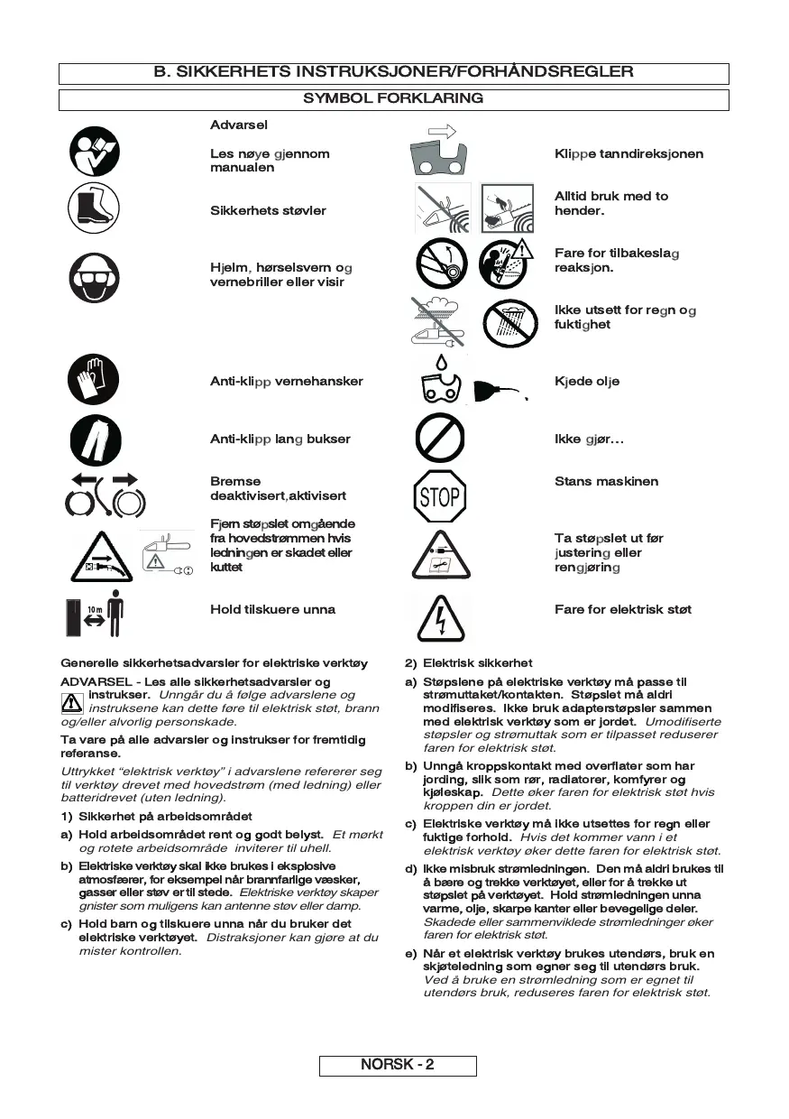 SYMBOL FORKLARING Advarsel Les nøye gjennom manualen Klippe tanndireksjonen Sikkerhets støvler Alltid bruk med to hender. Fare for tilbakeslag reaksjon. Hjelm, hørselsvern og vernebriller eller visir Ikke utsett for regn og fuktighet 10 m Anti-klipp vernehansker Kjede olje Anti-klipp lang bukser Ikke gjør… Bremse deaktivisert,aktivisert Stans maskinen Fjern støpslet omgående fra hovedstrømmen hvis ledningen er skadet eller kuttet Ta støpslet ut før justering eller rengjøring Hold tilskuere unna Fare for elektrisk støt Generelle sikkerhetsadvarsler for elektriske verktøy ADVARSEL - Les alle sikkerhetsadvarsler og instrukser. Unngår du å følge advarslene og instruksene kan dette føre til elektrisk støt, brann og/eller alvorlig personskade. Ta vare på alle advarsler og instrukser for fremtidig referanse.