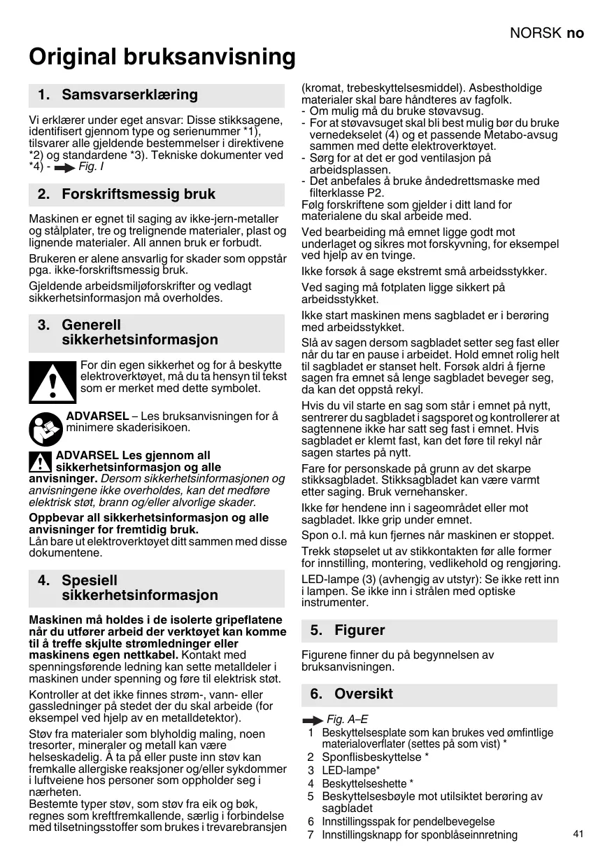 Vi erklærer under eget ansvar: Disse stikksagene, identifiszert gjennom type og serienummer *1), tilsvarer alle gjeldende bestemmelser i direktivene *2) og standardene *3). Tekniske dokumenter ved *4)- Fig. I