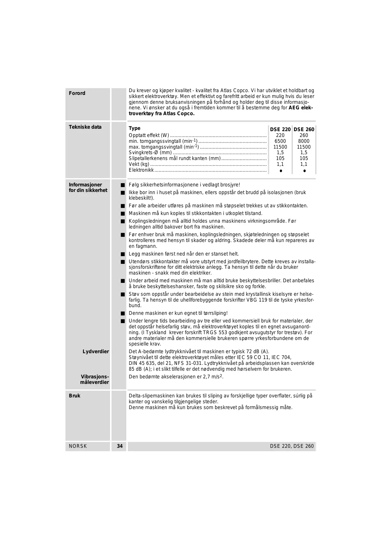 Last ned instruksjonene for din Elektrisk verktøy i PDF-format gratis! Finn veiledningen din DSE 260 - AEG-ELECTROLUX og ta den elektroniske enheten tilbake i hendene. På denne siden er alle dokumenter som er nødvendige for bruken av enheten din publisert. DSE 260 av merket AEG-ELECTROLUX.