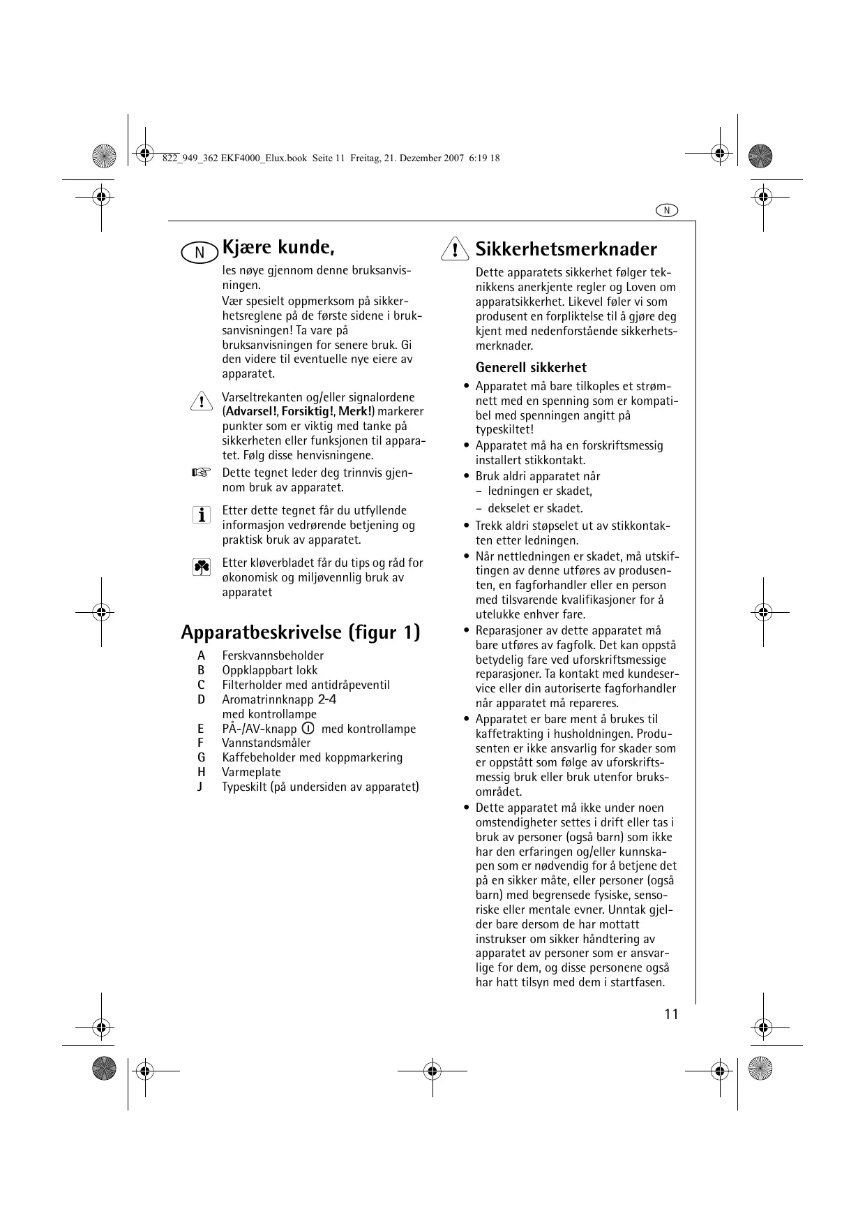 Dette apparatets sikkerhet følger tek-nikkens anerkjente regler og Loven om apparatsikkerhet. Likevel føl er vi som produsent en forpliktelse til a gjore deg kjent med nedenforstående sikkerhets-merknader.