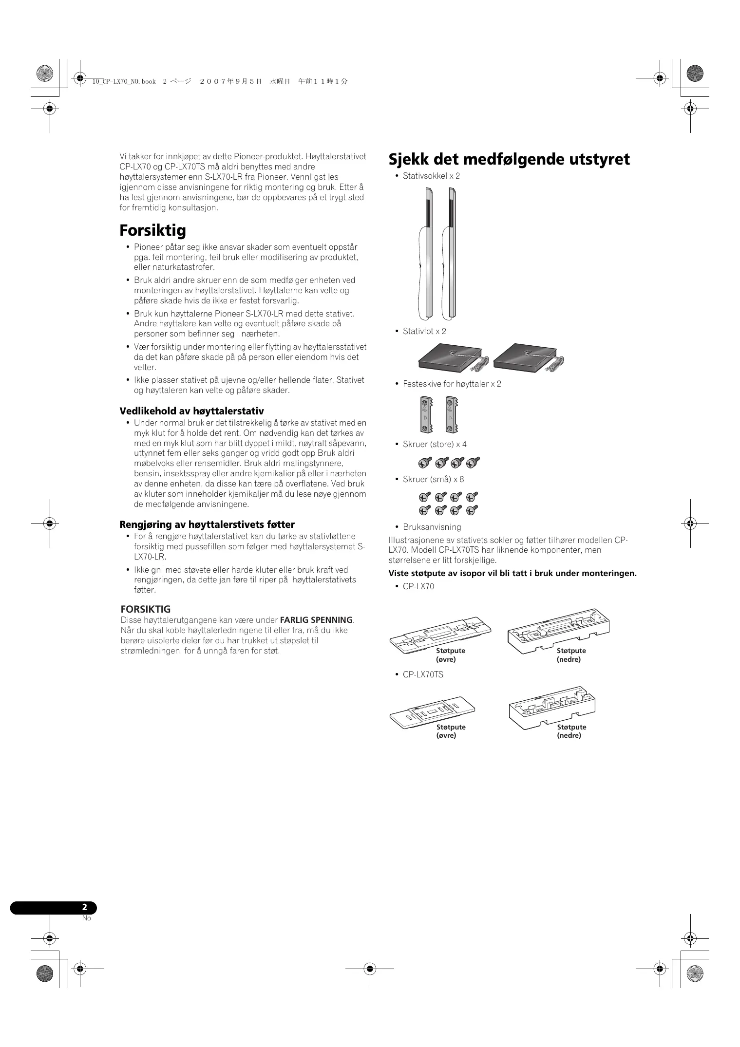 Private husholdninger i EU-landene, pluss Sveits og Norge kan levere brukte elektronikkprodukter gratis til bestemte anlegg for spesialavfall eller til forhandleren (ved kjap av et nytt, tlsvarende produkt) L land som ikke er nevnt ovenfor, ber vi deg kontakte de lokale myndighetene for informasjon om korrekte avhendingsmetoder. När du gjer det, hjelper du til à sikre at det kasserte produktet blir korrekt behandiet, gjenbrukt eller gjenvunnet, og derved hindre at det forärsaker negative effekter pä milja og helse. Utgitt av Pioneer Corporation. Copyright © 2007 Pioneer Corporation. Alle rettigheter forbeholdt. +1e