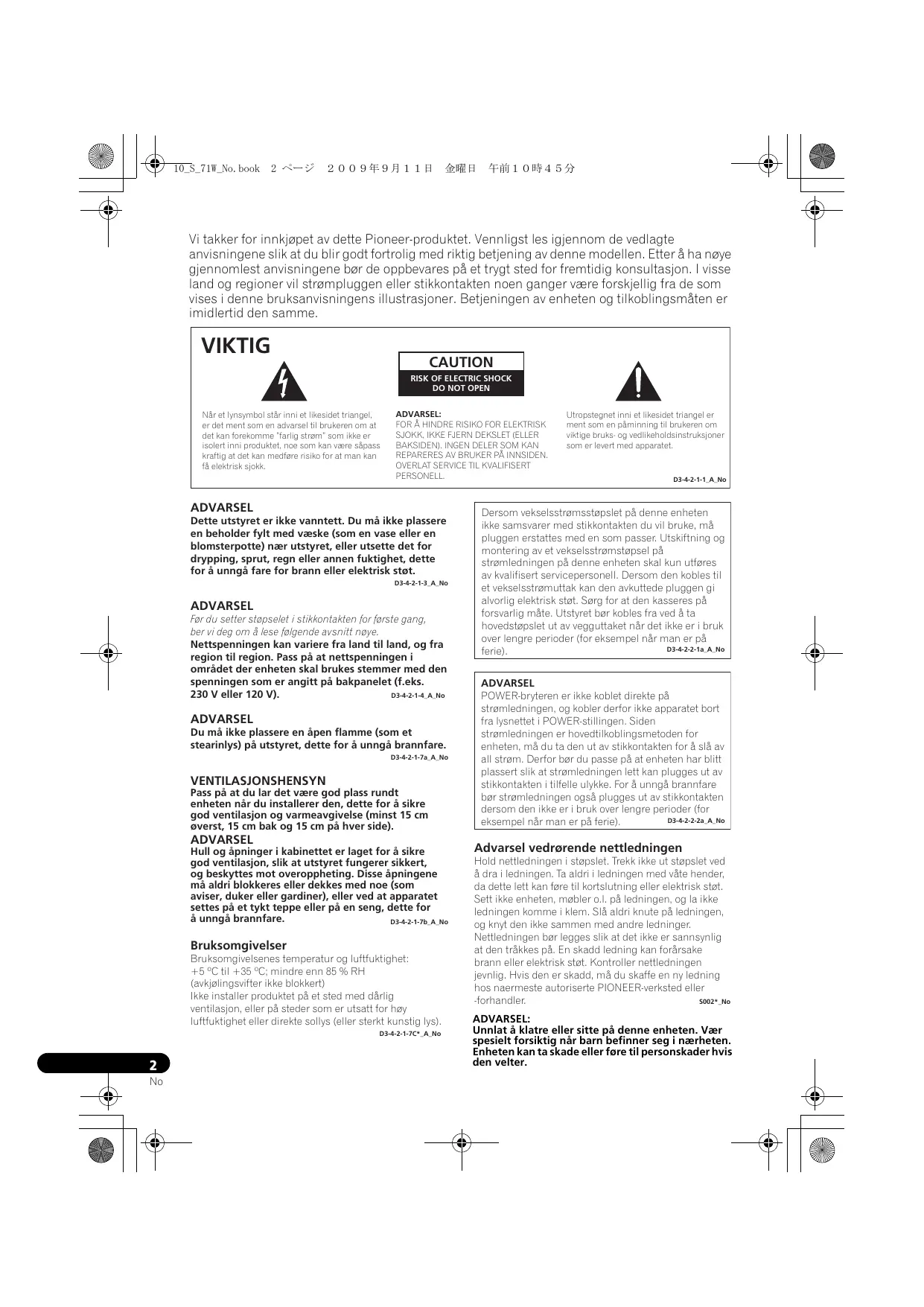 Advarsel vedrørende nettledningen Hold nettledningen i støpslet. Trekk ikke ut støpslet ved å dra i ledningen. Ta aldri i ledningen med våte hender, da dette lett kan føre til kortslutning eller elektrisk støt. Sett ikke enheten, møbler o.l. på ledningen, og la ikke ledningen komme i klem. Slå aldri knute på ledningen, og knyt den ikke sammen med andre ledninger. Nettledningen bør legges slik at det ikke er sannsynlig at den tråkkes på. En skadd ledning kan forårsake brann eller elektrisk støt. Kontroller nettledningen jevnlig. Hvis den er skadd, må du skaffe en ny ledning hos naermeste autoriserte PIONEER-verksted eller -forhandler. S002*_No