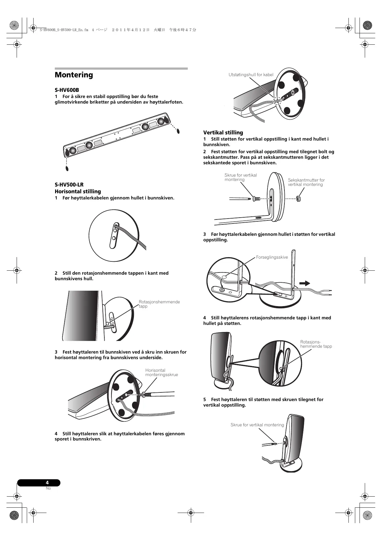 S-HV600B 1 For å sikre en stabil oppstilling bør du feste glimotvirkende briketter på undersiden av høyttalerfoten.