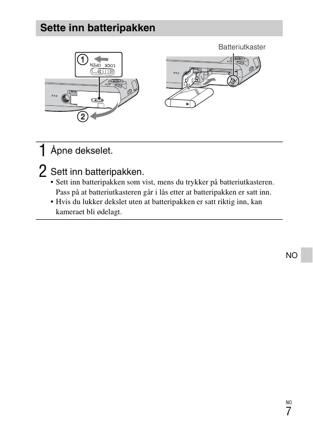 1 Åpne dekselet. inn batteripakken. 2 Sett • Sett inn batteripakken som vist, mens du trykker på batteriutkasteren. Pass på at batteriutkasteren går i lås etter at batteripakken er satt inn. • Hvis du lukker dekslet uten at batteripakken er satt riktig inn, kan kameraet bli ødelagt.