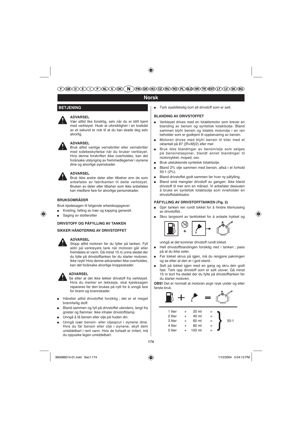 Håndter alltid drivstoffet forsiktig ; det er et meget brannfarlig stoff. Bland sammen og fyll på drivstoffet utendørs, langt fra gnister og flammer. Ikke inhaler drivstoffdamp. Unngå å få bensin eller olje på huden din. Unngå især bensin- eller oljesprut i øynene dine. Hvis du får bensin eller olje i øynene, skyll dem umiddelbart i rent vann. Hvis de fortsatt er irritert, må du oppsøke legen umiddelbart. 1 liter 2 liter 3 liter 4 liter 5 liter
