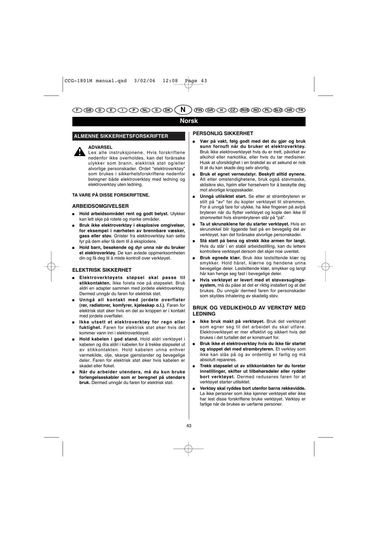 ADVARSEL Les alle instruksjonene. Hvis forskriftene nedenfor ikke overholdes, kan det forårsake ulykker som brann, elektrisk støt og/eller alvorlige personskader. Ordet "elektroverktøy" som brukes i sikkerhetsforskriftene nedenfor betegner både elektroverktøy med ledning og elektroverktøy uten ledning.