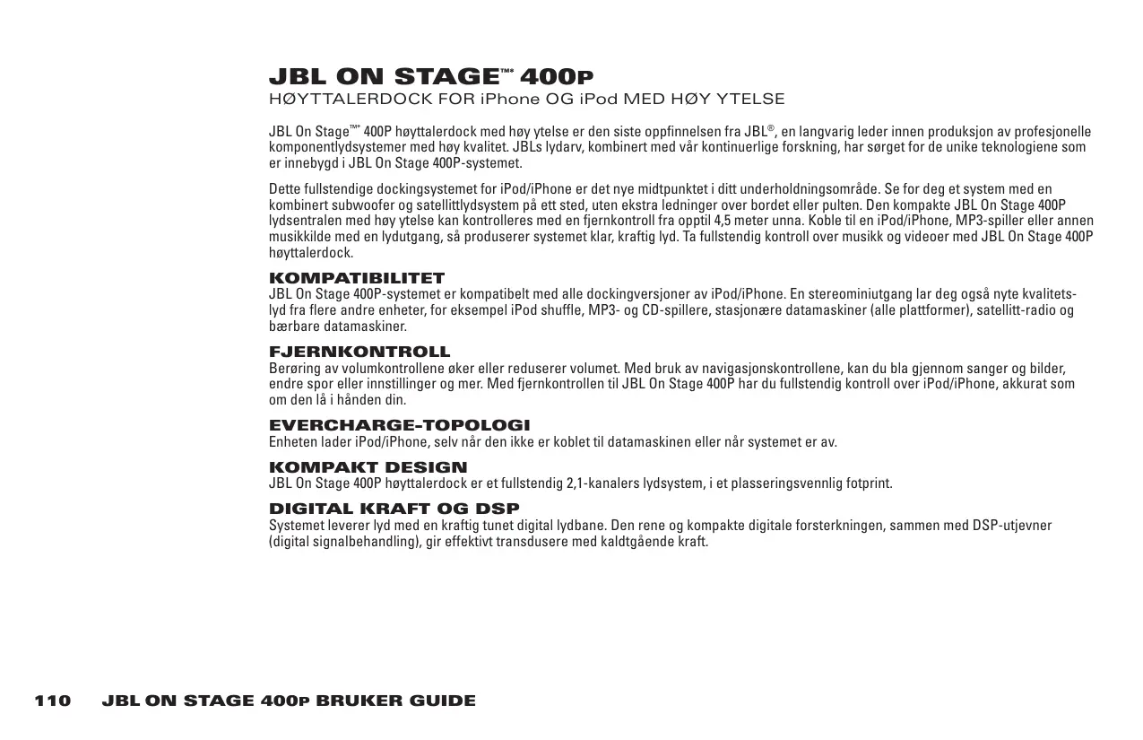 L’ADAPTATEUR APPROPRIÉ DOIT ÊTRE INSTALLÉ AVANT D’INSÉRER VOTRE iPod/iPhone DANS L’APPAREIL JBL®. ASSUREZ-VOUS QUE LE CONNECTEUR DE L’iPod/iPhone EST CORRECTEMENT ALIGNÉ AVEC LE CONNECTEUR DE L’APPAREIL JBL LORS DE L’INSTALLATION DE VOTRE iPod/iPhone. DANS LE CAS CONTRAIRE, CELA POURRAIT ENDOMMAGER LE CONNECTEUR DE L’iPod/iPhone, RENDANT CELUI-CI INUTILISABLE. Stage 400P, à haute performance et compact, est piloté par une télécommande jusqu’à 4,5 mètres. Raccordé à votre iPod/iPhone, lecteur MP3 ou à d’autres sources musicales avec un jack audio, le système délivre un son puissant et net. Contrôlez totalement votre musique et vos vidéos avec l’enceinte d’accueil JBL On Stage 400P. COMPATIBILITÉ Le système JBL On Stage 400P est compatible avec toutes les versions à insertion de l’iPod/iPhone. Une connexion stéréo par mini-jack vous permet également de profiter d’un son audio de haute qualité en provenance d’une variété d’appareils, comme l’iPod shuffle, les lecteurs MP3 et CD, les ordinateurs de bureau (toutes plates-formes), les radios satellite et les ordinateurs portables. TÉLÉCOMMANDE Un simple appui sur les touches Volume augmente ou diminue le volume. Grâce aux touches Navigation, parcourez chansons et photos, modifiez pistes et réglages, et plus encore. Avec la télécommande du JBL On Stage 400P, vous contrôlez entièrement votre iPod/iPhone, comme si vous le teniez dans votre main. TOPOLOGIE CHARGEMENT PERMANENT L’appareil recharge votre iPod/iPhone, même lorsqu’il n’est pas raccordé à l’ordinateur ou que le système est éteint. DESIGN COMPACT L’enceinte d’accueil JBL On Stage 400P est un système audio complet à 2.1 canaux, avec une surface d’encombrement facile à placer. PUISSANCE NUMÉRIQUE ET DSP Le système délivre le son avec un chemin audio numérique puissamment ajusté. L’amplification numérique propre et compacte, associée à une égalisation DSP (traitement numérique du signal), alimente efficacement les transducteurs avec une puissance tranquille.