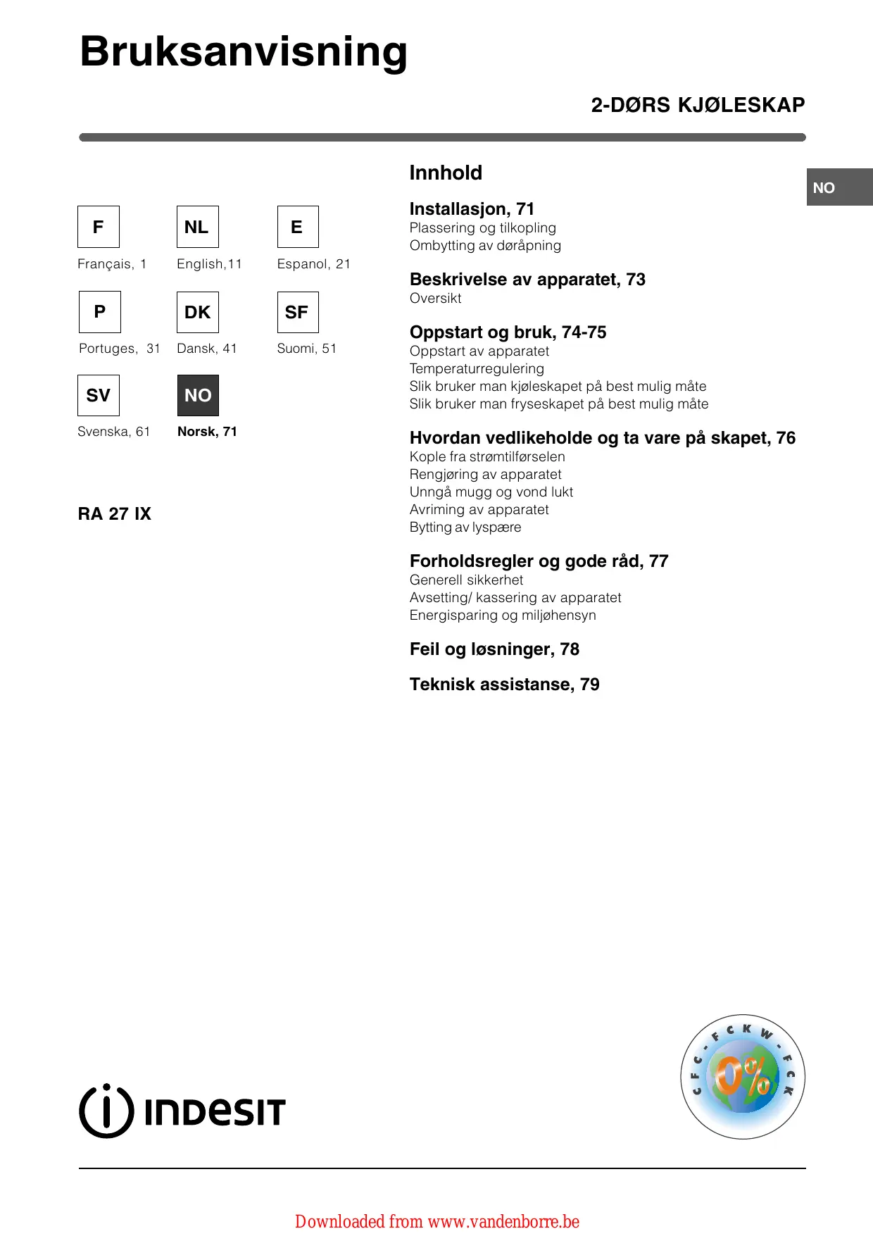 Téléchargez la notice de votre Kjøleskap au format PDF gratuitement ! Retrouvez votre notice RA 27 IX - INDESIT et reprennez votre appareil électronique en main. Sur cette page sont publiés tous les documents nécessaires à l'utilisation de votre appareil RA 27 IX de la marque INDESIT.