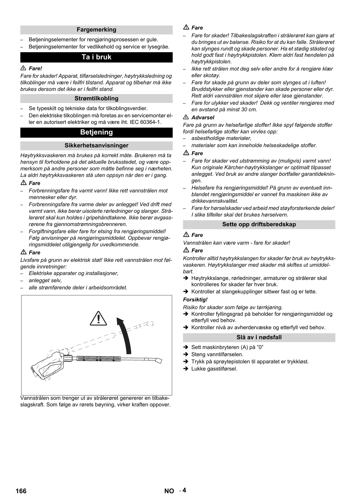 Se typeskilt og tekniske data for tilkoblingsverdier. Den elektriske tilkoblingen må foretas av en servicemontør eller en autorisert elektriker og må være iht. IEC 60364-1. Betjening Sikkerhetsanvisninger Høytrykksvaskeren må brukes på korrekt måte. Brukeren må ta hensyn til forholdene på det aktuelle bruksstedet, og være oppmerksom på andre personer som måtte befinne seg i nærheten. La aldri høytrykksvaskeren stå uten oppsyn når den er i gang. Fare – Forbrenningsfare fra varmt vann! Ikke rett vannstrålen mot mennesker eller dyr. – Forbrenningsfare fra varme deler av anlegget! Ved drift med varmt vann, ikke berør uisolerte rørledninger og slanger. Strålerøret skal kun holdes i gripehåndtakene. Ikke berør avgassrørene fra gjennomstrømningsbrenneren. – Forgiftningsfare eller fare for etsing fra rengjøringsmiddel! Følg anvisninger på rengjøringsmiddelet. Oppbevar rengjøringsmiddelet utilgjengelig for uvedkommende. Fare Livsfare på grunn av elektrisk støt! Ikke rett vannstrålen mot følgende innretninger: – Elektriske apparater og installasjoner, – anlegget selv, – alle strømførende deler i arbeidsområdet.