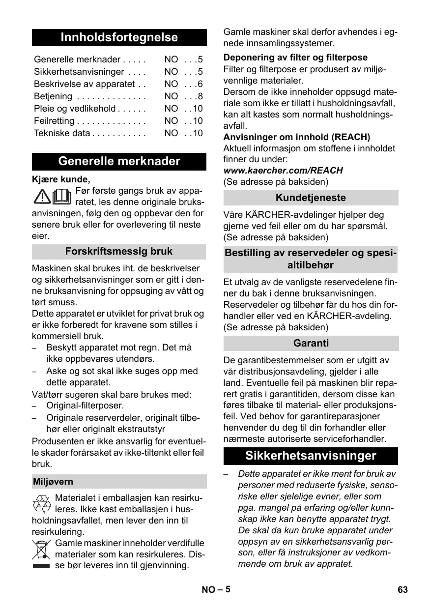 Deponering av filter og filterpose Filter og filterpose er produsert av miljøvennlige materialer. Dersom de ikke inneholder oppsugd materiale som ikke er tillatt i husholdningsavfall, kan alt kastes som normalt husholdningsavfall. Anvisninger om innhold (REACH) Aktuell informasjon om stoffene i innholdet finner du under: www.kaercher.com/REACH (Se adresse på baksiden)