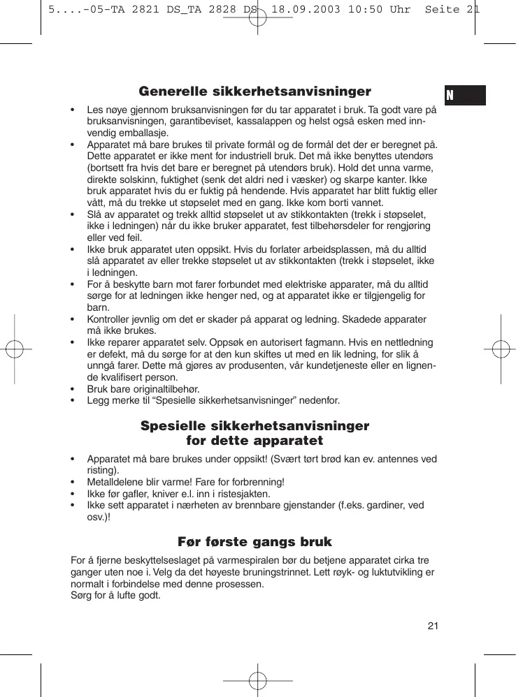 Før første gangs bruk For å fjerne beskyttelseslaget på varmespiralen bør du betjene apparatet cirka tre ganger uten noe i. Velg da det høyeste bruningstrinnet. Lett røyk- og luktutvikling er normalt i forbindelse med denne prosessen. Sørg for å lufte godt. 21