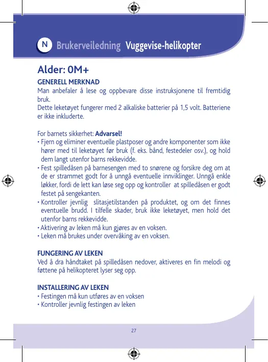 Alder: 0M+ GENERELL MERKNAD Man anbefaler å lese og oppbevare disse instruksjonene til fremtidig bruk. Dette leketøyet fungerer med 2 alkaliske batterier på 1,5 volt. Batteriene er ikke inkluderte. For barnets sikkerhet: Advarsel! • Fjern og eliminer eventuelle plastposer og andre komponenter som ikke hører med til leketøyet før bruk (f. eks. bånd, festedeler osv.), og hold dem langt utenfor barns rekkevidde. • Fest spilledåsen på barnesengen med to snørene og forsikre deg om at de er strammet godt for å unngå eventuelle innviklinger. Unngå enkle løkker, fordi de lett kan løse seg opp og kontroller at spilledåsen er godt festet på sengekanten. • Kontroller jevnlig slitasjetilstanden på produktet, og om det finnes eventuelle brudd. I tilfelle skader, bruk ikke leketøyet, men hold det utenfor barns rekkevidde. • Aktivering av leken må kun gjøres av en voksen. • Leken må brukes under overvåking av en voksen. FUNGERING AV LEKEN Ved å dra håndtaket på spilledåsen nedover, aktiveres en fin melodi og føttene på helikopteret lyser seg opp. INSTALLERING AV LEKEN • Festingen må kun utføres av en voksen • Kontroller jevnlig festingen av leken 27