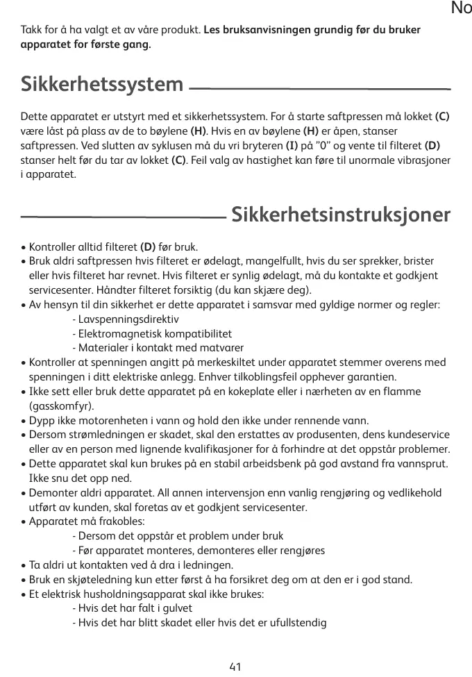 Dette apparatet er utstyrt med et sikkerhetssystem. For a starte saftpressen ma lokket (C) vare last pa plass av de to boylene (H). Hvis en av boylene (H) er apen, stanser saftpressen. Ved slutten av syklusen ma du vri bryteren (I) pa "0" og vente til filteret (D) stanser helt før du tar av lokket (C). Feil valg av hastighet kan fere til unormale vibrasjoner i apparatet.