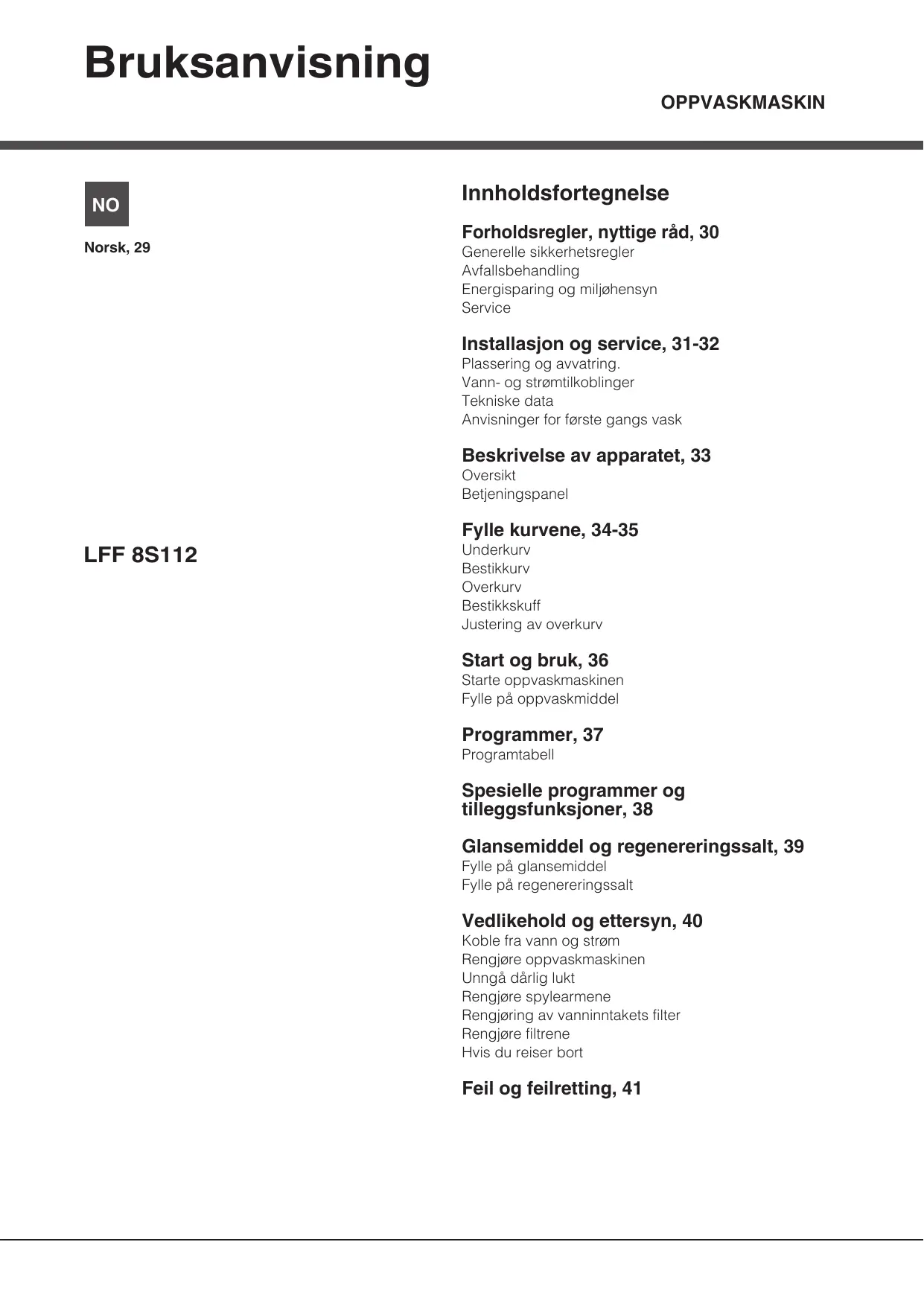 Bruksanvisning OPPVASKMASKIN [no Innholdsfortegnelse Forholdsregler, nyttige räd, 30 Norsk, 29 Generelle sikkerhetsregler Avfallsbehandling Energisparing og miljghensyn Service Installasjon og service, 31-32 Plassering og avvatring. Vann- og stramtilkoblinger Tekniske data Anvisninger for farste gangs vask Beskrivelse av apparatet, 33 Oversikt Betjeningspanel Fylle kurvene, 34-35 LFF 85112 Underkurv Bestikkurv Overkurv Bestikkskuff Justering av overkurv Start og bruk, 36 Starte oppvaskmaskinen Fylle pà oppvaskmiddel Programmer, 37 Programtabell Spesielle programmer og tilleggsfunksjoner, 38 Glansemiddel og regenereringssalt, 39 Fylle pà glansemiddel Fylle pà regenereringssalt Vedlikehold og ettersyn, 40 Koble fra vann og stram Rengjgre oppvaskmaskinen Unngä dèrlig lukt Rengjgre spylearmene Rengjaring av vanninntakets filter Rengjgre filtrene Hvis du reiser bort Feil og feilretting, 41