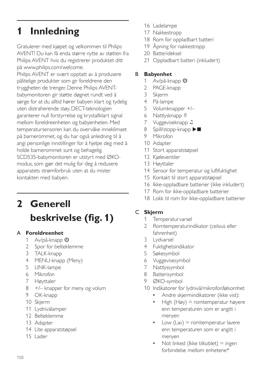 1 Innledning Gratulerer med kjøpet og velkommen til Philips AVENT! Du kan få enda større nytte av støtten fra Philips AVENT hvis du registrerer produktet ditt på www.philips.com/welcome. Philips AVENT er svært opptatt av å produsere pålitelige produkter som gir foreldrene den tryggheten de trenger. Denne Philips AVENTbabymonitoren gir støtte døgnet rundt ved å sørge for at du alltid hører babyen klart og tydelig uten distraherende støy. DECT-teknologien garanterer null forstyrrelse og krystallklart signal mellom foreldreenheten og babyenheten. Med temperatursensoren kan du overvåke inneklimaet på barnerommet, og du har også anledning til å angi personlige innstillinger for å hjelpe deg med å holde barnerommet sunt og behagelig. SCD535-babymonitoren er utstyrt med ØKOmodus, som gjør det mulig for deg å redusere apparatets strømforbruk uten at du mister kontakten med babyen. 2 Generell beskrivelse (fig. 1) A Foreldreenhet 1 Av/på-knapp 3 2 Spor for belteklemme 3 TALK-knapp 4 MENU-knapp (Meny) 5 LINK-lampe 6 Mikrofon 7 Høyttaler 8 +/– knapper for meny og volum 9 OK-knapp 10 Skjerm 11 Lydnivålamper 12 Belteklemme 13 Adapter 14 Lite apparatstøpsel 15 Lader