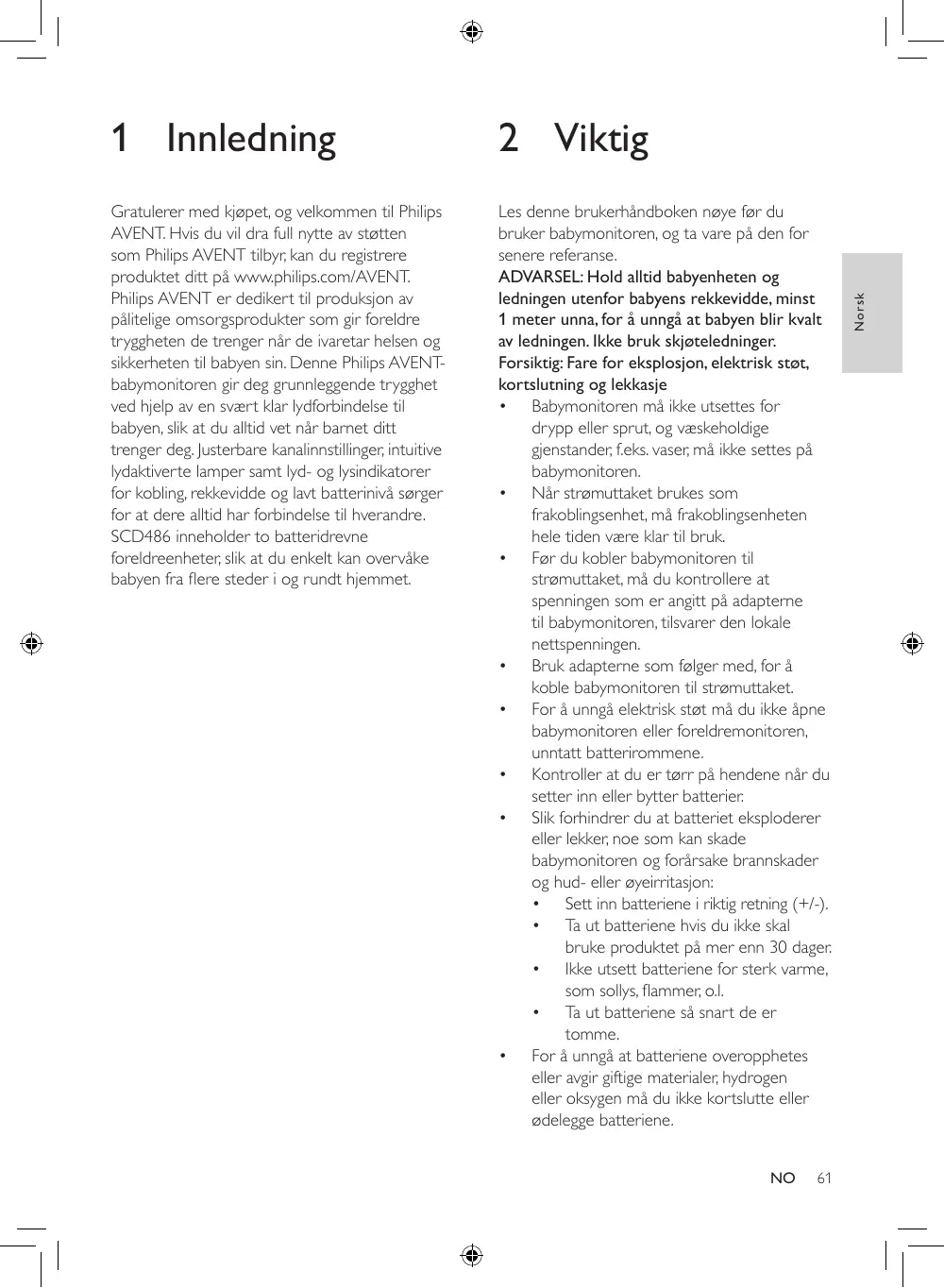 2 Viktig Gratulerer med kjøpet, og velkommen til Philips AVENT. Hvis du vil dra full nytte av støtten som Philips AVENT tilbyr, kan du registrere produktet ditt på www.philips.com/AVENT. Philips AVENT er dedikert til produksjon av pålitelige omsorgsprodukter som gir foreldre tryggheten de trenger når de ivaretar helsen og sikkerheten til babyen sin. Denne Philips AVENT babymonitoren gir deg grunnleggende trygghet ved hjelp av en svært klar lydforbindelse til babyen, slik at du alltid vet når barnet ditt trenger deg. Justerbare kanalinnstillinger, intuitive lydaktiverte lamper samt lyd- og lysindikatorer for kobling, rekkevidde og lavt batterinivå sørger for at dere alltid har forbindelse til hverandre. SCD486 inneholder to batteridrevne foreldreenheter, slik at du enkelt kan overvåke babyen fra flere steder i og rundt hjemmet. Les denne brukerhåndboken nøye før du bruker babymonitoren, og ta vare på den for senere referanse. ADVARSEL: Hold alltid babyenheten og ledningen utenfor babyens rekkevidde, minst 1 meter unna, for å unngå at babyen blir kvalt av ledningen. Ikke bruk skjøteledninger. Forsiktig: Fare for eksplosjon, elektrisk støt, kortslutning og lekkasje