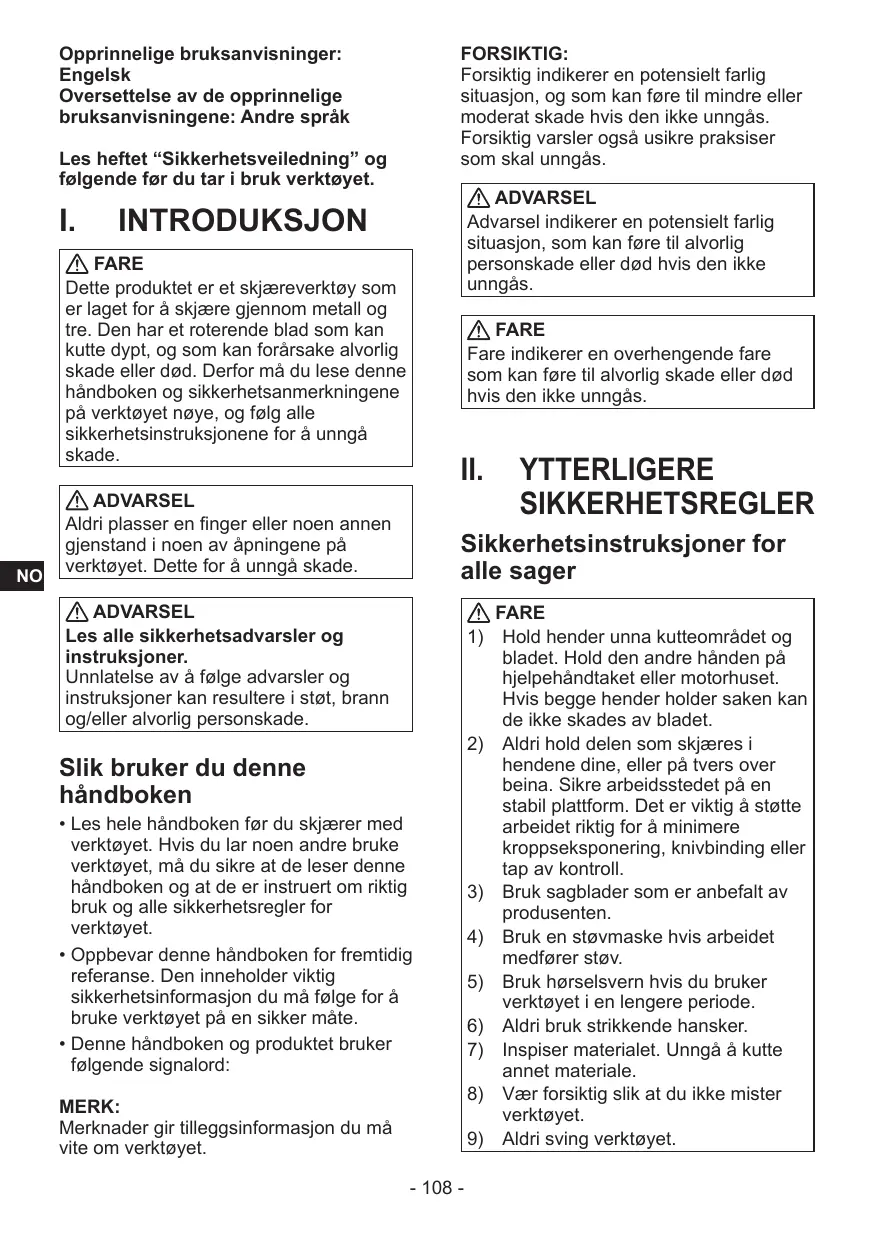 Dette produit ter er et skjæverktøy som er laget for a skjære gjennom metall og tre. Den har et roterende blad som kan kutte dypt, og som kan forårsake alvorlig skade eller død. Derfor mä du lese denen handboken og sikkerhetsanmerkningene på verktøyet nøye, og følg alle sikkerhetsinstruksjonene for a unngå skade.