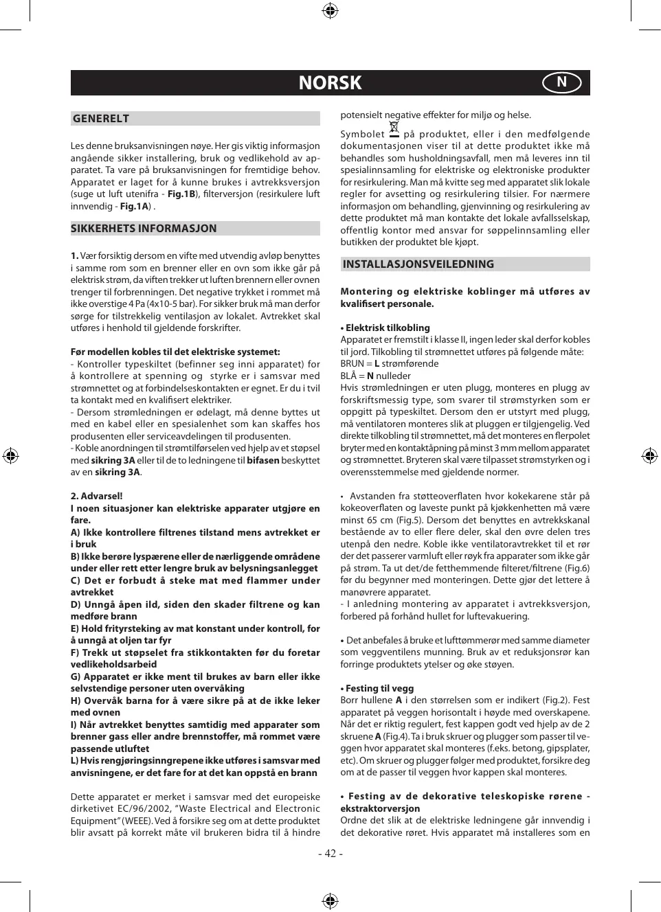 - Controlar los datos de matrícula (que se encuentran en el interior del aparato) para constatar que la tensión y la potencia correspondan a la de la red y el enchufe de conexión sea idóneo. En caso de dudas, recurra a un electricista calificado. - Si el cable de alimentación está dañado, se debe cambiar con un cable o conjunto especial de cables que puede suministrar tanto el fabricante como el servicio de asistencia técnica. - Conecte el dispositivo a la red de alimentación a través de un enchufe con fusible 3A o a los dos cables de la línea bifásica protegidos por un fusible 3A. 2. ¡Atención! En determinadas circunstancias los electrodomésticos pueden ser peligrosos. A) No intente controlar los filtros cuando la campana está en funcionamiento B) Durante el uso prolongado de la instalación de iluminación o inmediatamente después, no toque las lámparas ni las zonas adyacentes a ellas. C) Está prohibido cocinar a fuego directo debajo de la campana D) Evite dejar la llama libre porque puede dañar los filtros y constituye un riesgo de incendio E) Controle constantemente los alimentos fritos para evitar que el aceite sobrecalentado se prenda fuego F) Antes de efectuar cualquier operación de mantenimiento, desconecte la campana de la red eléctrica. G) Este aparato no debe ser utilizado por niños o personas que necesiten de supervisión. H) Controle que los niños no jueguen con el aparato. I) Cuando la campana se utiliza simultáneamente con aparatos que queman gas u otros combustibles, el ambiente debe estar adecuadamente ventilado. L) Si las operaciones de limpieza no se realizan respetando las instrucciones, hay peligro de incendio.