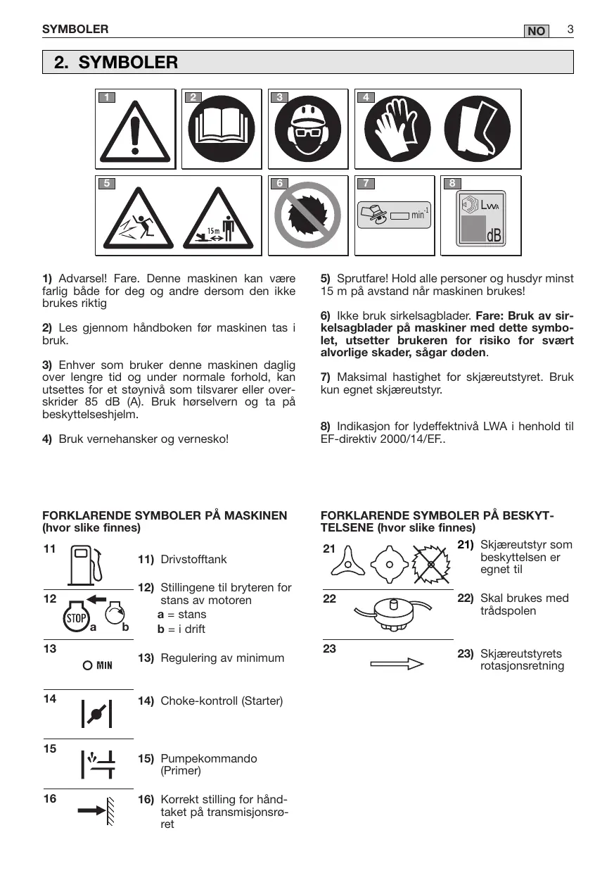 3) Enhver som brukerijke maskinen daglig over lengre tid og under normale forhold, kan utsettes for et stynivå som tilsvarer erler overskrider 85 dB (A). Bruk hørselvern og ta på beskytttelseshjelm.