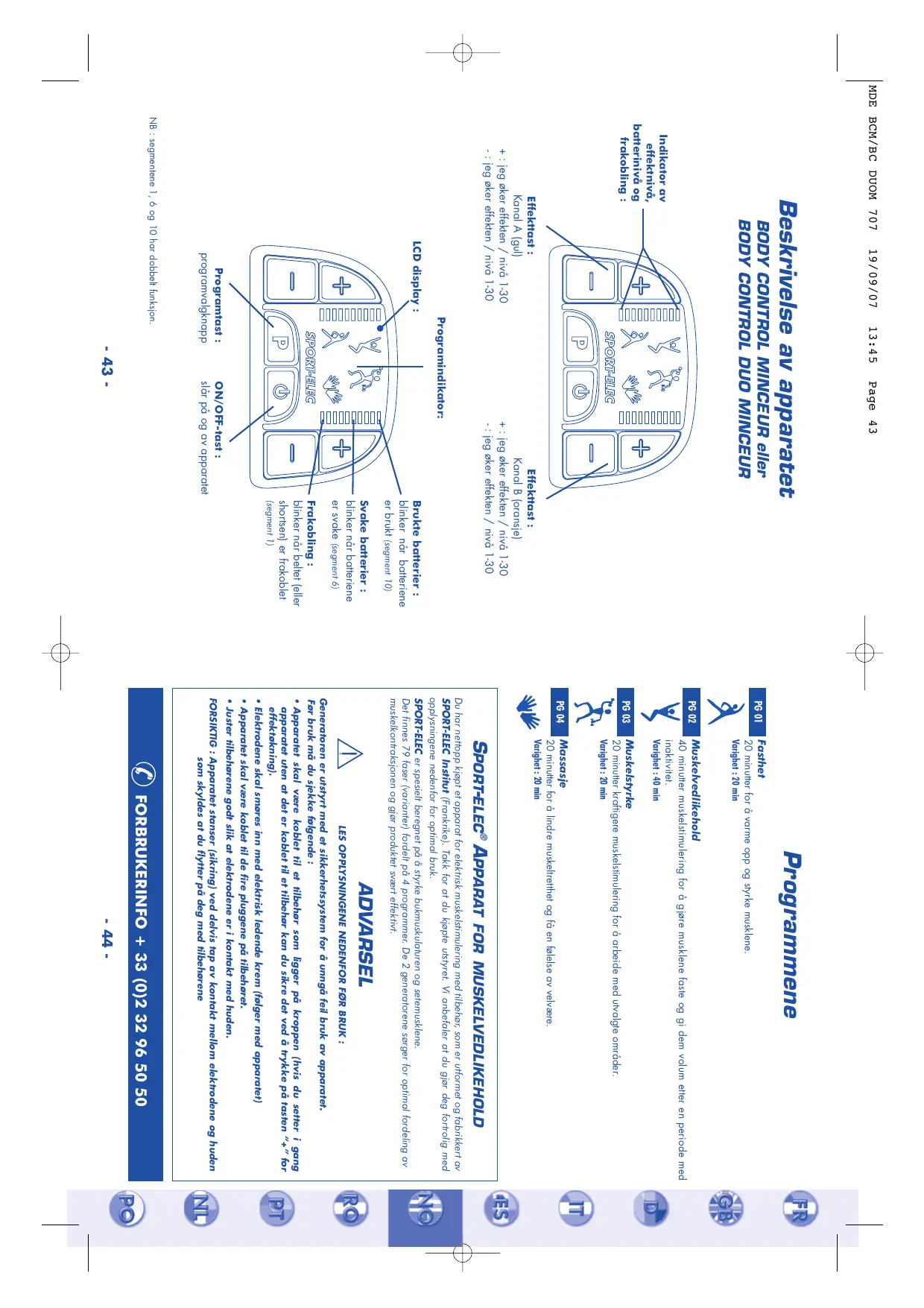 - Det er mulig å begynne syklusen for ett av programmene på nytt igjen på en annen muskelsone eller å endre programmet samtidig som du forblir på samme muskelsone, men du må ikke overgå 40 minutters anvendelse per muskelsone per dag. - Hvis du ønsker optimal anvendelse, kan du bruke skjemaene som finnes i denne brosjyren. - Den elektriske enheten og apparatets ledninger kan rengjøres med en klut fuktet med desinfiseringsløsning (f.eks. Mercryl) uttynnet med vann med forholdet 1/10. SIKKERHETSKONTROLL Hvert annet år må følgende punkter kontrolleres :