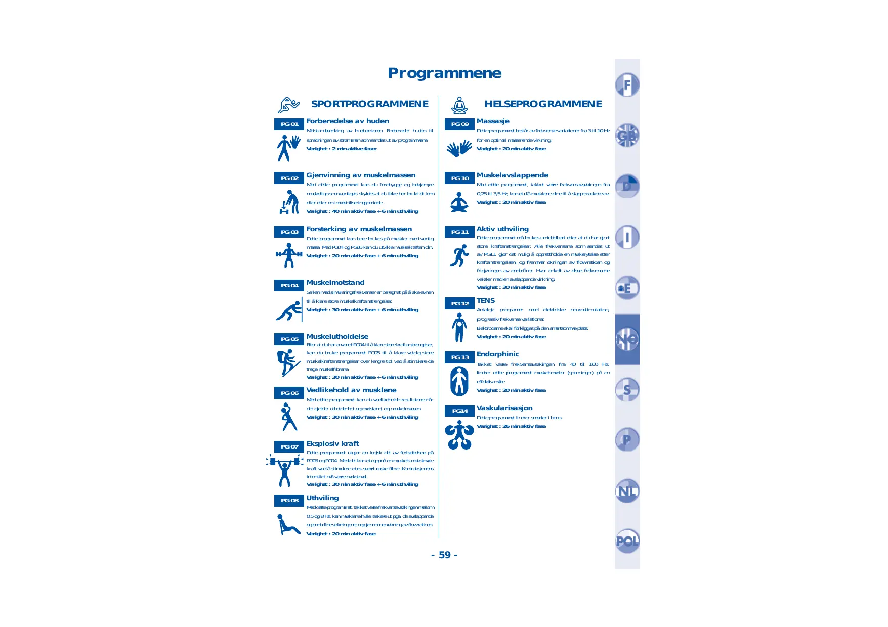 Programmene SPORTPROGRAMMENE PG 01 Forberedelse av huden PG 02 Gjenvinning av muskelmassen PG 03 Forsterking av muskelmassen PG 04 Muskelmotstand PG 05 PG 06 HELSEPROGRAMMENE Motstandssenking av hudbarrieren. Forbereder huden til spredningen av strømmen som sendes ut av programmene. Varighet : 2 min aktive faser Med dette programmet kan du forebygge og bekjempe muskeltap som vanligvis skyldes at du ikke har brukt et lem eller etter en immobiliseringsperiode. Varighet : 40 min aktiv fase + 6 min uthviling Dette programmet kan bare brukes på muskler med vanlig masse. Med PG04 og PG05 kan du utvikle muskelkraften din. Varighet : 20 min aktiv fase + 6 min uthviling Serien med simuleringsfrekvenser er beregnet på å øke evnen til å klare store muskelkraftanstrengelser. Varighet : 30 min aktiv fase + 6 min uthviling PG 09 Massasje PG 10 Muskelavslappende PG 11 Aktiv uthviling PG 12 TENS PG 13 Endorphinic PG14 Vaskularisasjon Muskelutholdelse Etter at du har anvendt PG04 til å klare store kraftanstrengelser, kan du bruke programmet PG05 til å klare veldig store muskelkraftanstrengelser over lengre tid, ved å stimulere de trege muskelfibrene. Varighet : 30 min aktiv fase + 6 min uthviling Vedlikehold av musklene Med dette programmet kan du vedlikeholde resultatene når det gjelder utholdenhet og motstand, og muskelmassen. Varighet : 30 min aktiv fase + 6 min uthviling PG 07 Eksplosiv kraft PG 08 Uthviling Dette programmet utgjør en logisk del av fortsettelsen på PG03 og PG04. Med det kan du oppnå en muskels maksimale kraft ved å stimulere dens svært raske fibre. Kontraksjonens intensitet må være maksimal. Varighet : 30 min aktiv fase + 6 min uthviling Med dette programmet, takket være frekvensavsøkingen mellom 0,5 og 8 Hz, kan musklene hvile raskere ut pga. de avslappende og endorfine virkningene, og gjennom en økning av flow-ratioen. Varighet : 20 min aktiv fase