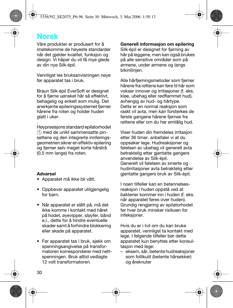 5356392_SE2075_P6-96 Seite 30 Mittwoch, 3. Mai 2006 1:50 13 Norsk Våre produkter er produsert for å imøtekomme de høyeste standarder når det gjelder kvalitet, funksjon og design. Vi håper du vil få mye glede av din nye Silk·épil. Vennligst les bruksanvisningen nøye før apparatet tas i bruk. Braun Silk·épil EverSoft er designet for å fjerne uønsket hår så effektivt, behagelig og enkelt som mulig. Det anerkjente epileringssystemet fjerner hårene fra roten og holder huden glatt i uker. Høypresisjons standard epilatorhodet 1 med de unikt sammensatte pinsettene og den integrerte innføringsgeometrien sikrer en effektiv epilering og fjerner selv meget korte hårstrå (0,5 mm lange) fra roten. Advarsel