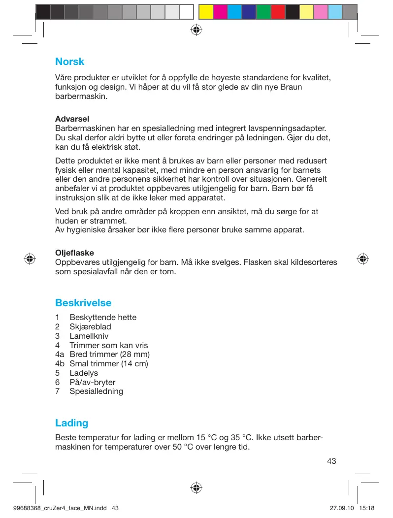 Norsk Våre produkter er utviklet for å oppfylle de høyeste standardene for kvalitet, funksjon og design. Vi håper at du vil få stor glede av din nye Braun barbermaskin. Advarsel Barbermaskinen har en spesialledning med integrert lavspenningsadapter. Du skal derfor aldri bytte ut eller foreta endringer på ledningen. Gjør du det, kan du få elektrisk støt. Dette produktet er ikke ment å brukes av barn eller personer med redusert fysisk eller mental kapasitet, med mindre en person ansvarlig for barnets eller den andre personens sikkerhet har kontroll over situasjonen. Generelt anbefaler vi at produktet oppbevares utilgjengelig for barn. Barn bør få instruksjon slik at de ikke leker med apparatet. Ved bruk på andre områder på kroppen enn ansiktet, må du sørge for at huden er strammet. Av hygieniske årsaker bør ikke flere personer bruke samme apparat. Oljeflaske Oppbevares utilgjengelig for barn. Må ikke svelges. Flasken skal kildesorteres som spesialavfall når den er tom. Beskrivelse