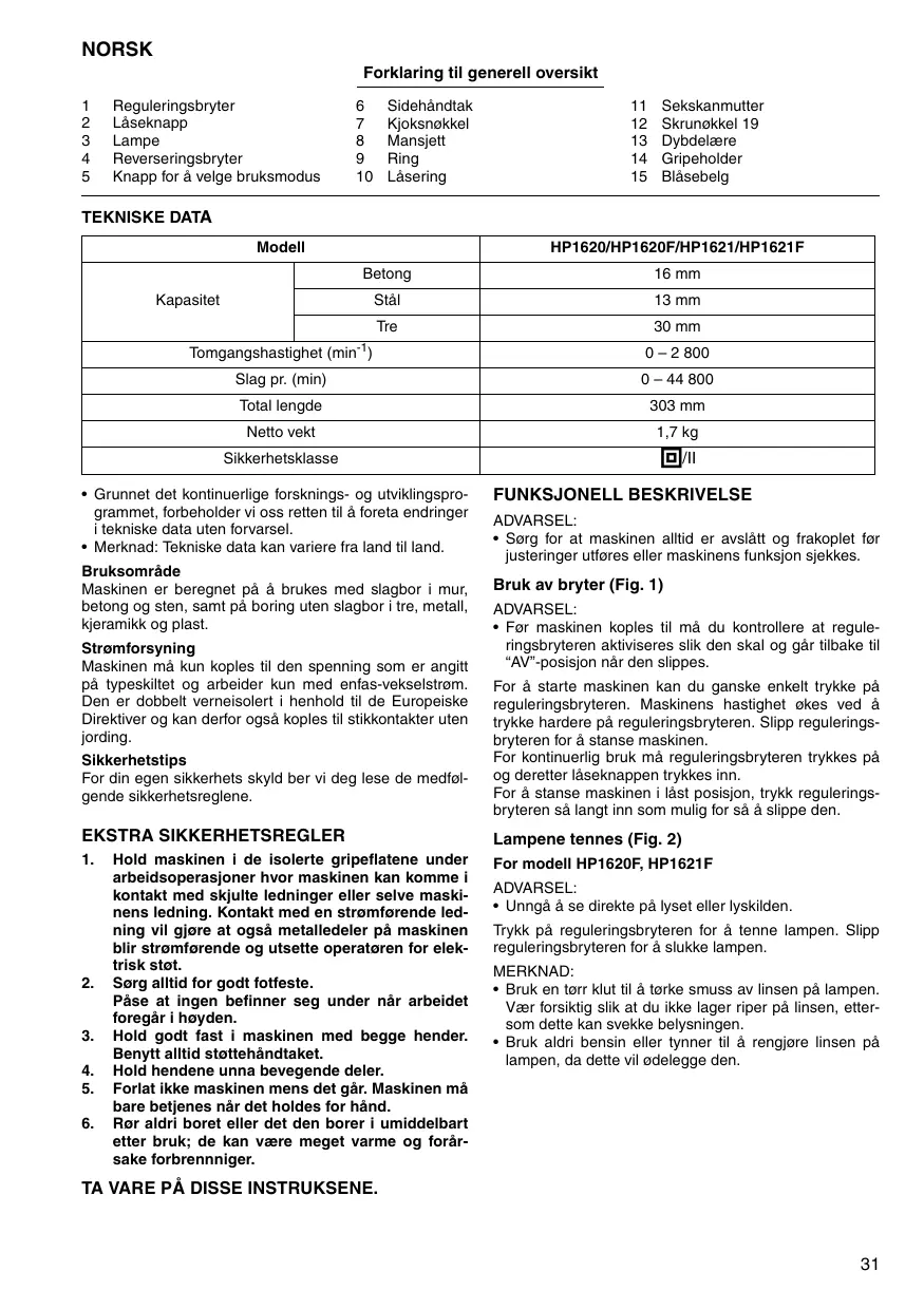 Hold maskinen i de isolerte gripeflatene under arbeidsoperasjoner hvor maskinen kan komme i kontakt med skjulte ledninger eller selve maskinens ledning. Kontakt med en strømførende ledning vil gjøre at også metalledeler på maskinen blir strømførende og utsette operatøren for elektrisk støt. Sørg alltid for godt fotfeste. Påse at ingen befinner seg under når arbeidet foregår i høyden. Hold godt fast i maskinen med begge hender. Benytt alltid støttehåndtaket. Hold hendene unna bevegende deler. Forlat ikke maskinen mens det går. Maskinen må bare betjenes når det holdes for hånd. Rør aldri boret eller det den borer i umiddelbart etter bruk; de kan være meget varme og forårsake forbrennniger. ADVARSEL: