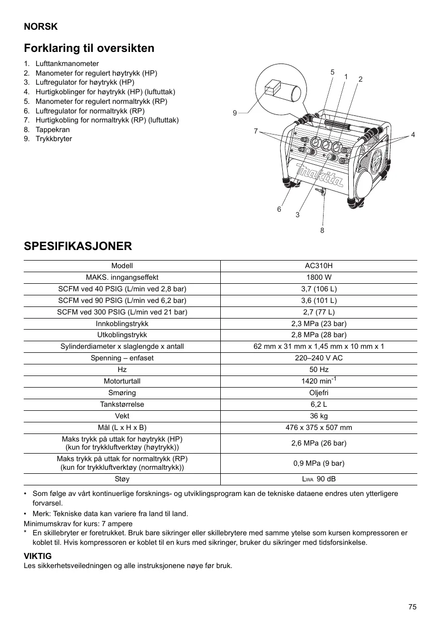NORSK Forklaring til oversikten Lufitankmanometer Manometer for regulert hoytrykk (HP) Luftregulator for haytrykk (HP) Hurtigkoblinger for haytrykk (HP) (luftuttak) Manometer for regulert normaltrykk (RP) Luftregulator for normaltrykk (RP) Hurtigkobling for normaltrykk (RP) (luftuttak) Tappekran . Trykkbryter pLoNpnswn SPESIFIKASJONER Modell AC310H MAKS. inngangseffekt 1800 W SCFM ved 40 PSIG (L/min ved 2,8 bar) 3,7 (106L) SCFM ved 90 PSIG (L/min ved 6,2 bar) 3,6(101L) SCFM ved 300 PSIG (Limin ved 21 bar) 27(77L) Innkoblingstrykk 2,3 MPa (23 bar) Utkoblingstrykk 2,8 MPa (28 bar) Sylinderdiameter x slaglengde x antall 62 mm x 31 mm x 1,45 mm x 10 mm x 1 Spenning — enfaset 220-240 V AC Hz 50 Hz Motorturtall 1420 min? Smaring Oferr Tankstorrelse 621 Vekt 36 kg Mal (LxHxB) 476 x 375 x 507 mm Maks trykk pà uttak for hoytrykk (HP) kun for trykklufiverktay (haytrykk)) 2,6 MPa (26 bar) Maks trykk pà uttak for normaltrykk (RP) kun for trykklufiverktay (normaltrykk)) 0,9 MPa (9 bar) Stoy Lua 90 dB + Som falge av värt kontinuerlige forsknings- og utviklingsprogram kan de tekniske dataene endres uten ytterligere forvarsel. + Merk: Tekniske data kan variere fra land til land Minimumskrav for kurs: 7 ampere *_ En skillebryter er foretrukket. Bruk bare sikringer eller skillebrytere med samme ytelse som kursen kompressoren er koblet til. Hvis kompressoren er koblet til en kurs med sikringer, bruker du sikringer med tidsforsinkelse. VIKTIG Les sikkerhetsveiledningen og alle instruksjonene noye far bruk.