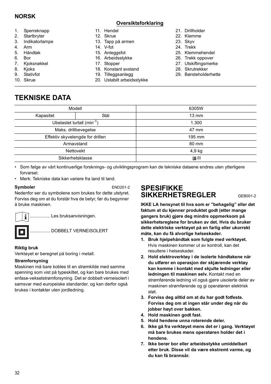 - Merk: Tekniske data kan variere fra land til land. END201-2 Symboler Nedenfor ser du symbolene som brukes for dette utstyret. Forviss deg om at du forstår hva de betyr, før du begynner å bruke maskinen. ................ Les bruksanvisningen. ................ DOBBELT VERNEISOLERT Riktig bruk Verktøyet er beregnet på boring i metall. Strømforsyning Maskinen må bare kobles til en strømkilde med samme spenning som vist på typeskiltet, og kan bare brukes med enfase-vekselstrømforsyning. Det er dobbelt verneisolert i samsvar med europeiske standarder, og kan derfor også brukes i kontakter uten jordledning.