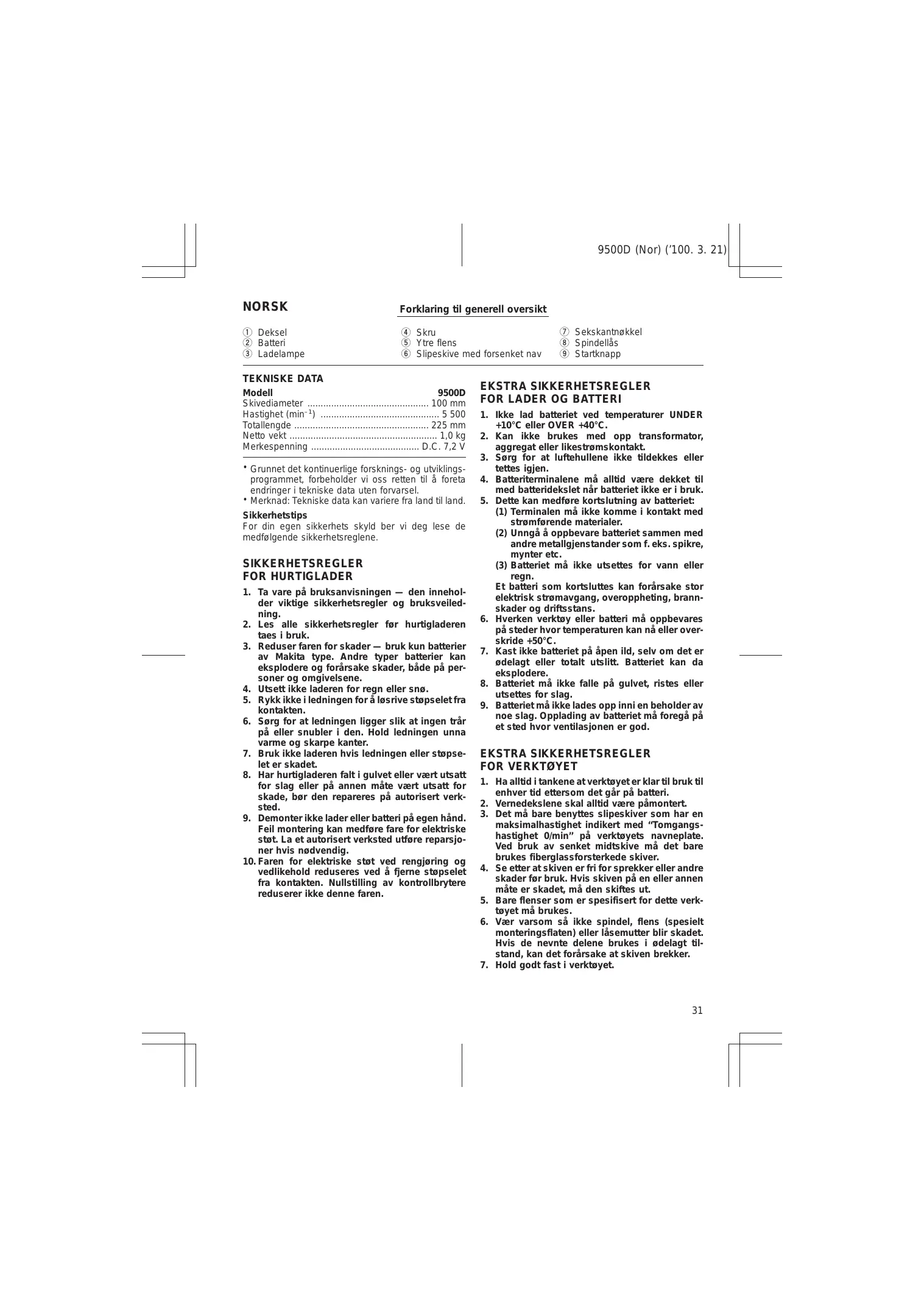 TEKNISKE DATA Modell 9500D Skivediameter 100 mm –1 Hastighet (min ) 5 500 Totallengde 225 mm Netto vekt 1,0 kg Merkespenning D.C. 7,2 V • Grunnet det kontinuerlige forsknings- og utviklingsprogrammet, forbeholder vi oss retten til å foreta endringer i tekniske data uten forvarsel. • Merknad: Tekniske data kan variere fra land til land. Sikkerhetstips For din egen sikkerhets skyld ber vi deg lese de medfølgende sikkerhetsreglene.