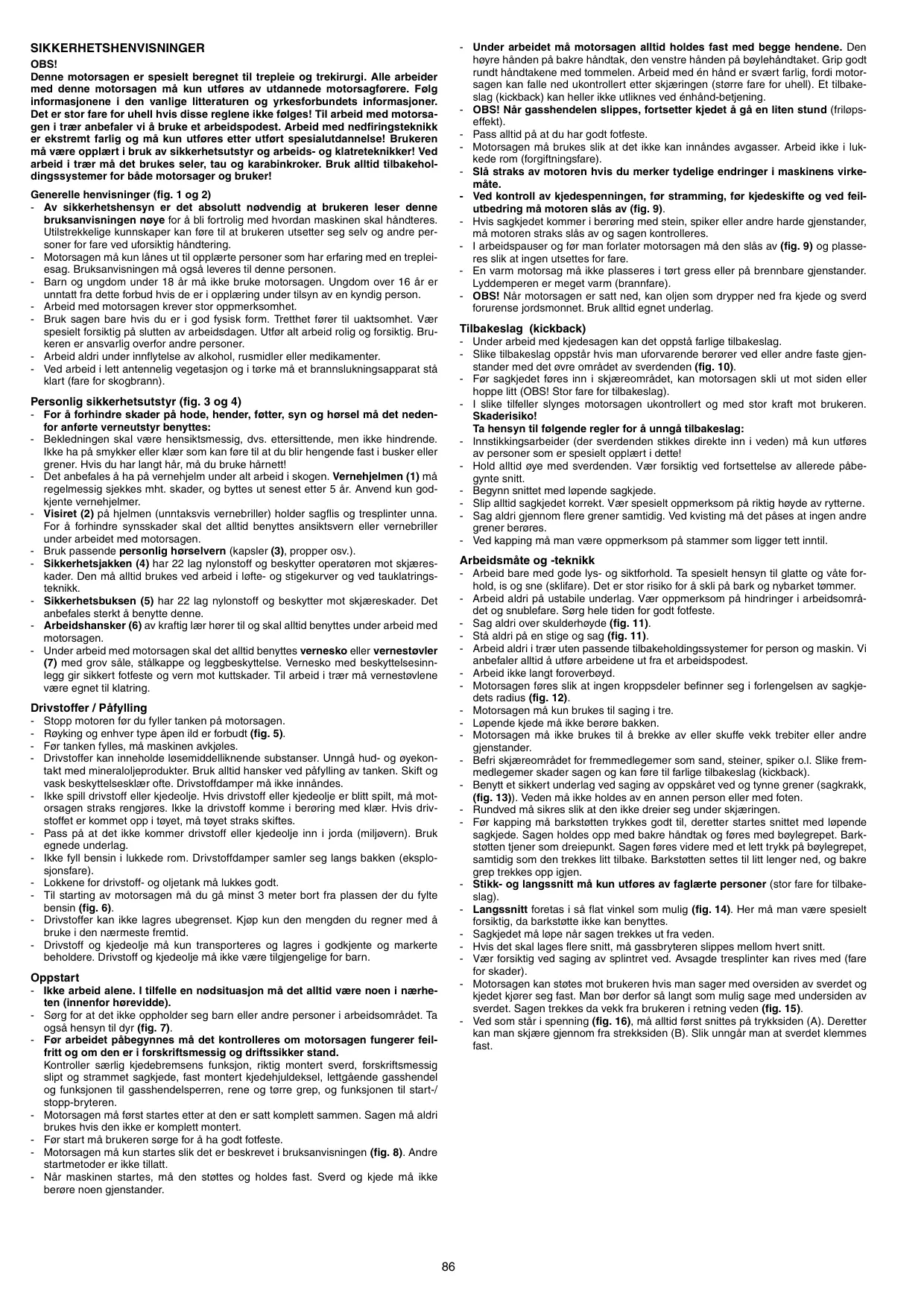Bruk sagen bare hvis du er i god fysisk form. Tretthet forer til uaktsomhet. Vær spesielt forsiktig pà slutten av arbeidsdagen. Utior alt arbeid rolig og forsiktig. Bru- keren er ansvarlig overtor andre personer.