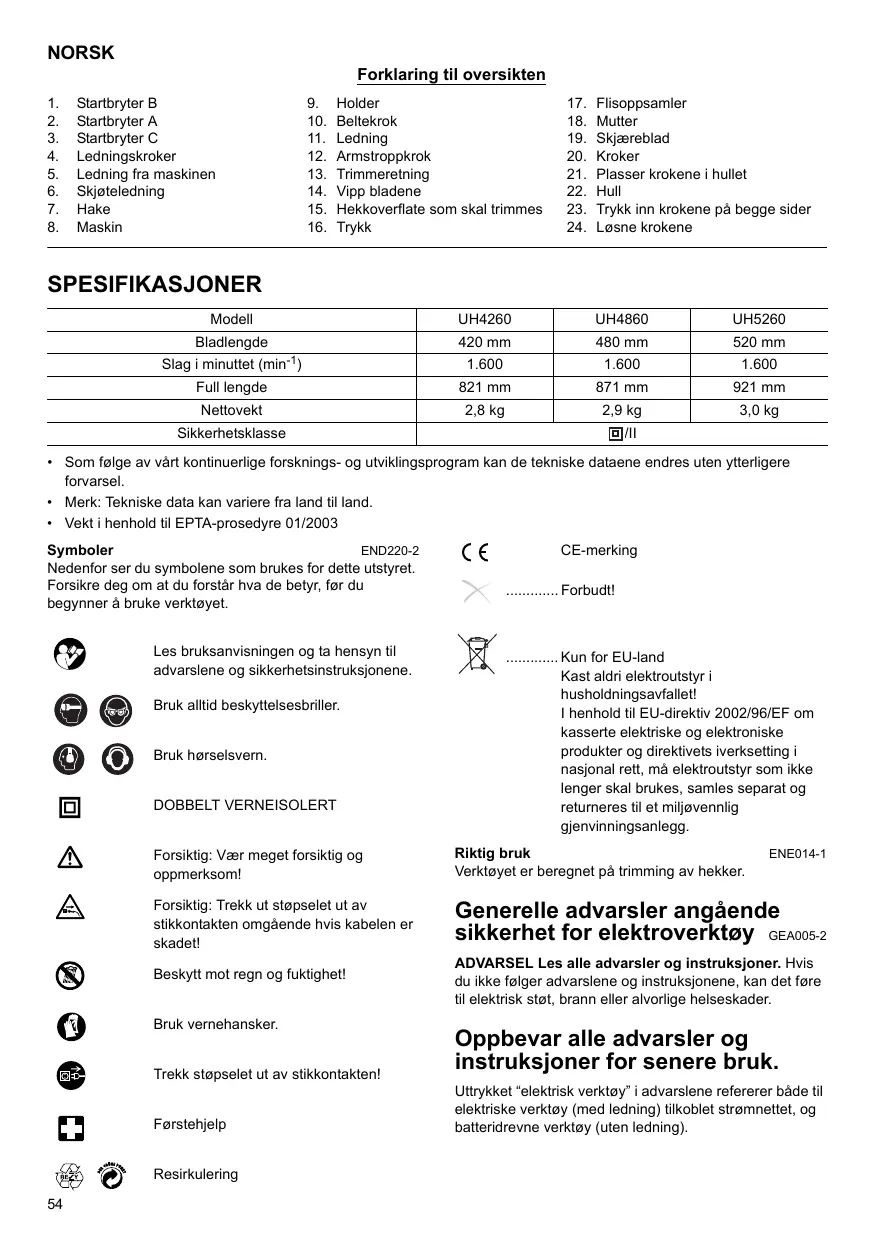 - Vekt i henhold til EPTA-prosedyre 01/2003 END220-2 Symboler Nedenfor ser du symbolene som brukes for dette utstyret. Forsikre deg om at du forstår hva de betyr, før du begynner å bruke verktøyet. Les bruksanvisningen og ta hensyn til advarslene og sikkerhetsinstruksjonene. Bruk alltid beskyttelsesbriller. Bruk hørselsvern. DOBBELT VERNEISOLERT ............. Forbudt! ............. Kun for EU-land Kast aldri elektroutstyr i husholdningsavfallet! I henhold til EU-direktiv 2002/96/EF om kasserte elektriske og elektroniske produkter og direktivets iverksetting i nasjonal rett, må elektroutstyr som ikke lenger skal brukes, samles separat og returneres til et miljøvennlig gjenvinningsanlegg. Forsiktig: Vær meget forsiktig og oppmerksom! Riktig bruk Verktøyet er beregnet på trimming av hekker. Forsiktig: Trekk ut støpselet ut av stikkontakten omgående hvis kabelen er skadet! Generelle advarsler angående sikkerhet for elektroverktøy GEA005-2 Beskytt mot regn og fuktighet! ADVARSEL Les alle advarsler og instruksjoner. Hvis du ikke følger advarslene og instruksjonene, kan det føre til elektrisk støt, brann eller alvorlige helseskader. Bruk vernehansker. Trekk støpselet ut av stikkontakten! Førstehjelp Resirkulering