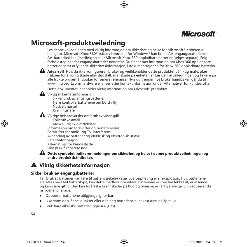 Muskel- og skjelettlidelser Bruk av spillkontroller, tastatur, mus eller andre elektroniske inndataenheter kan fare til alvorig skade eller sykdem. När du spiller videospil, kan du enkelte ganger oppleve ubehag og plager i hender, armer, skuldre, nakke eller andre kroppsdeler. Hvis du imidlertid har symptomer som vedvarende eller tibakevendende ubehag, smerte, banking, verking, prikking, nummenhet, svie eller stivhet, MÀ DU IKKE IGNORERE DISSE VARSLENE. TA RASKT KONTAKT MED HELSEPERSONELL, selv om symptamene forekommer när du ikke bruker videospilet Sike symptomer kan indikere smertefulle og noen ganger permanent invalidiserende skader eller sykdommer pà nerver, muskler, sener, blodkar og andre deler av kroppen.Slike muskel- og skjelettlidelser omfatter karpaltunnelsyndrom, senchinnebetennelse, seneskjedebetennelse, vibrasjonssyndrom ag andre tilstander. Selv om forskerne enda ikke har svar pà alle sparsmäl rundt muskel- og skjelettlidelser, er et allmenn enighet om at det er mange faktarer som kan bidra til at de oppstär, blant annet medisinske og fysiske tilstander, stress og stressmestring, generel helsetilstand og hvordan en person plasserer og bruker kroppen sin ved arbeid og andre aktiviteter (nkludert bruk av videospil). Noen undersakelser viser at hvor mye tid en person bruker pà en aktivitet, ogsà kan veære en faktor. L'En sun spiliguide" finner du noen retningslinjer som kan hjelpe til med à gjare arbeid og spilling mer behagelg, og redusere faren for muskelsykdommer (Hlgjengelig pà www xbox. com). Disse retningslinjene inkluderer falgende emner. + Hvordan du finner frem til behagelige stilinger og unngär de ubekvemme. + Hvordan du slapper avi hender, fingre og andre kroppsdeler. + Hvordan du tar pauser. + Hvordan du utvikler en sunn livssti. Huis du har sparsmäl om hvordan livsstil, aktviteter eller medisinsk eller fysisk tilstand kan ha sammenheng med muskel- og skjelettlidelser, bar du ta Kontakt med kvalifisert helsepersonell. Informasjon om forskrifter og bestemmelser Testet og funnet à være i overensstemmelse med FCC-reglene (Federal Communications Commission i USA). Tilkontor- og hjemmebruk. Ikke beregnet pà bruk innen maskinelle, medisinske eller industrielle anvendelsesomräder Alle typer endringer som ikke er uttrykkelig godkjent av Microsoft, kan fare til at brukeren mister retten til à bruke denne enheten. Dette produktet kan brukes med IT-utstyr som er NRTL- regstrert (UL, CSA, ETL og sà videre) og/eller IEC/EN 60950-kompatibelt (CE-merket), Det faiger ikke med noen deler som det kan utfares service pé. Denne enheten er klassifisert som et kommersielt produkt til bruk ved temperaturer fra +5 til +35 °C.