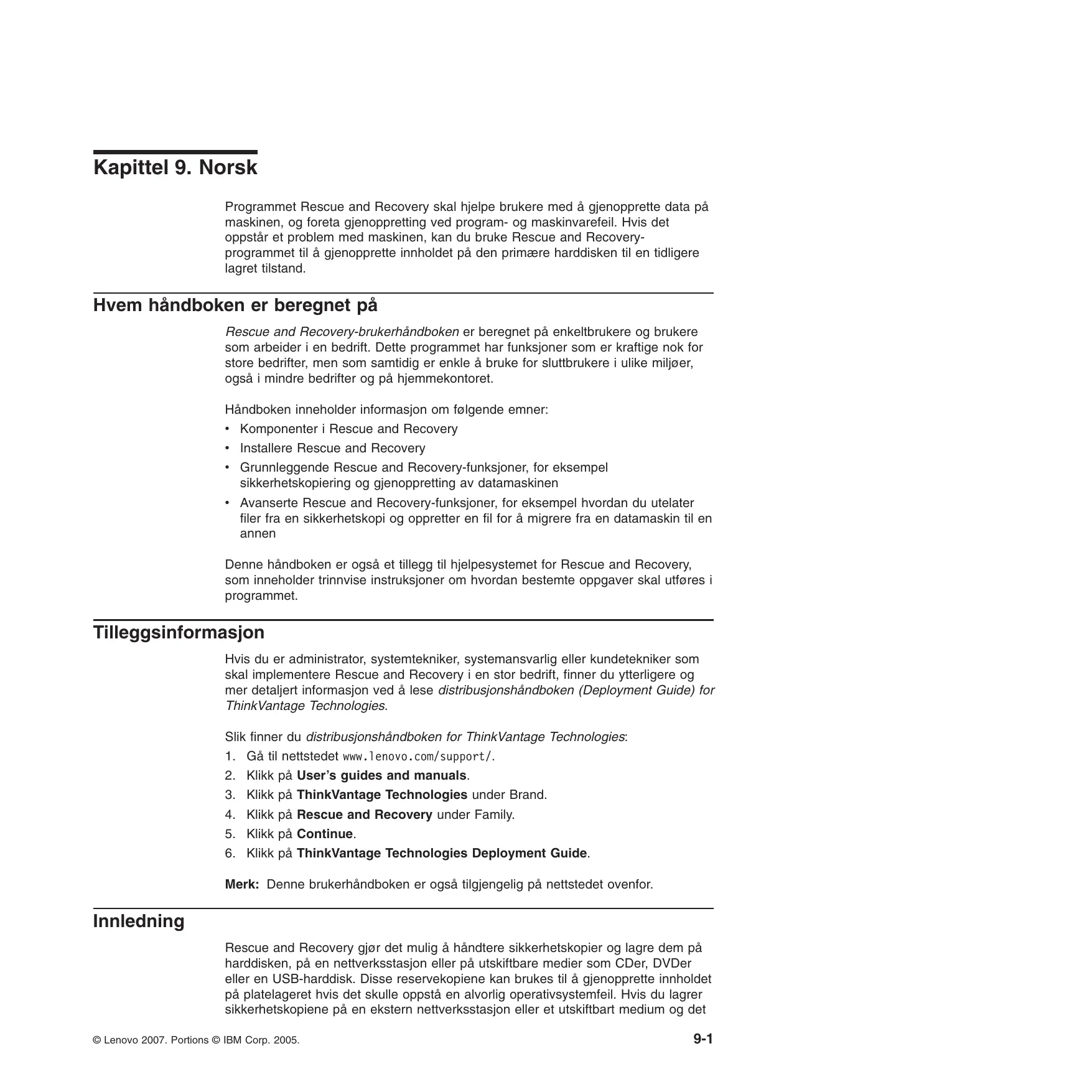 8-10 Rescue and Recovery™ User’s Guide Kapittel 9. Norsk Programmet Rescue and Recovery skal hjelpe brukere med å gjenopprette data på maskinen, og foreta gjenoppretting ved program- og maskinvarefeil. Hvis det oppstår et problem med maskinen, kan du bruke Rescue and Recoveryprogrammet til å gjenopprette innholdet på den primære harddisken til en tidligere lagret tilstand. Hvem håndboken er beregnet på Rescue and Recovery-brukerhåndboken er beregnet på enkeltbrukere og brukere som arbeider i en bedrift. Dette programmet har funksjoner som er kraftige nok for store bedrifter, men som samtidig er enkle å bruke for sluttbrukere i ulike miljøer, også i mindre bedrifter og på hjemmekontoret. Håndboken inneholder informasjon om følgende emner: v Komponenter i Rescue and Recovery v Installere Rescue and Recovery v Grunnleggende Rescue and Recovery-funksjoner, for eksempel sikkerhetskopiering og gjenoppretting av datamaskinen v Avanserte Rescue and Recovery-funksjoner, for eksempel hvordan du utelater filer fra en sikkerhetskopi og oppretter en fil for å migrere fra en datamaskin til en annen Denne håndboken er også et tillegg til hjelpesystemet for Rescue and Recovery, som inneholder trinnvise instruksjoner om hvordan bestemte oppgaver skal utføres i programmet. Tilleggsinformasjon Hvis du er administrator, systemtekniker, systemansvarlig eller kundetekniker som skal implementere Rescue and Recovery i en stor bedrift, finner du ytterligere og mer detaljert informasjon ved å lese distribusjonshåndboken (Deployment Guide) for ThinkVantage Technologies. Slik finner du distribusjonshåndboken for ThinkVantage Technologies: