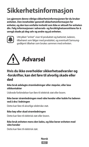 Le non-respect des consignes de sécurité peut entraîner des blessures graves, voire la mort N’utilisez pas de prises et de cordons d’alimentation endommagé(e)s ou de prises électriques mal fixées Les branchements non sécurisés engendrent un risque d’électrocution ou d’incendie. Ne touchez pas le cordon d’alimentation avec les mains mouillées et ne déconnectez pas le chargeur en tirant sur le cordon Vous risquez de vous électrocuter. Ne tordez et n’endommagez pas le cordon d’alimentation Vous risquez de vous électrocuter ou de provoquer un incendie. N’utilisez pas l’appareil avec les mains mouillées ou lorsque celui-ci est en cours de chargement Vous risquez de vous électrocuter.