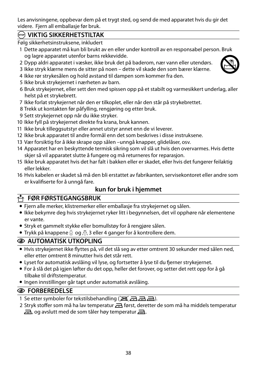 A VIKTIG SIKKERHETSTILTAK Følg sikkerhetsinstruksene, inkludert 1 Dette apparatet må kun bli brukt av en eller under kontroll av en responsabel person. Bruk og lagre apparatet utenfor barns rekkevidde. 2 Dypp aldri apparatet i væsker, ikke bruk det på baderom, nær vann eller utendørs. 3 Ikke stryk klærne mens de sitter på noen – dette vil skade den som bærer klærne. 4 Ikke rør strykesålen og hold avstand til dampen som kommer fra den. 5 Ikke bruk strykejernet i nærheten av barn. 6 Bruk strykejernet, eller sett den med spissen opp på et stabilt og varmesikkert underlag, aller helst på et strykebrett. 7 Ikke forlat strykejernet når den er tilkoplet, eller når den står på strykebrettet. 8 Trekk ut kontakten før påfylling, rengjøring og etter bruk. 9 Sett strykejernet opp når du ikke stryker. 10 Ikke fyll på strykejernet direkte fra krana, bruk kannen. 11 Ikke bruk tilleggsutstyr eller annet utstyr annet enn de vi leverer. 12 Ikke bruk apparatet til andre formål enn det som beskrives i disse instruksene. 13 Vær forsiktig for å ikke skrape opp sålen –unngå knapper, glidelåser, osv. 14 Apparatet har en beskyttende termisk sikring som vil slå ut hvis den overvarmes. Hvis dette skjer så vil apparatet slutte å fungere og må returneres for reparasjon. 15 Ikke bruk apparatet hvis det har falt i bakken eller er skadet, eller hvis det fungerer feilaktig eller lekker. 16 Hvis kabelen er skadet så må den bli erstattet av fabrikanten, servisekontoret eller andre som er kvalifiserte for å unngå fare.