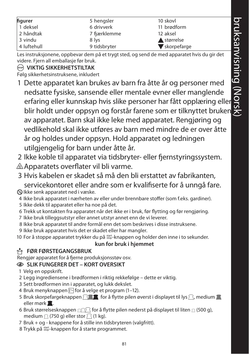 1 Choisissez une recette. 2 Placez les ingrédients dans la cuve à pain dans le bon ordre – cela est essentiel. 3 Placez la cuve à pain dans l'appareil et fermez le couvercle. 4 Utilisez le bouton de menu de Z pour choisir un programme (1-12). 5 Utilisez le bouton ghh de sélection de la couleur de la croûte pour aligner la flèche située sur la partie supérieure de l'affichage sur clair g, moyen h ou foncé h. 22