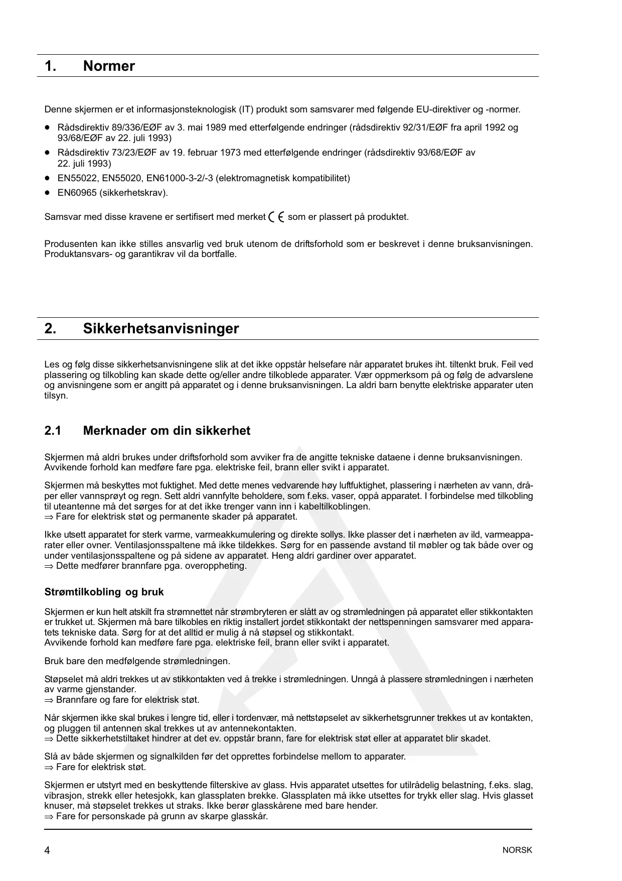 Merknader om din sikkerhet Skjermen må aldri brukes under driftsforhold som avviker fra de angitte tekniske dataene i denne bruksanvisningen. Avvikende forhold kan medføre fare pga. elektriske feil, brann eller svikt i apparatet. Skjermen må beskyttes mot fuktighet. Med dette menes vedvarende høy luftfuktighet, plassering i nærheten av vann, dråĆ per eller vannsprøyt og regn. Sett aldri vannfylte beholdere, som f.eks. vaser, oppå apparatet. I forbindelse med tilkobling til uteantenne må det sørges for at det ikke trenger vann inn i kabeltilkoblingen. ⇒ Fare for elektrisk støt og permanente skader på apparatet. Ikke utsett apparatet for sterk varme, varmeakkumulering og direkte sollys. Ikke plasser det i nærheten av ild, varmeappaĆ rater eller ovner. Ventilasjonsspaltene må ikke tildekkes. Sørg for en passende avstand til møbler og tak både over og under ventilasjonsspaltene og på sidene av apparatet. Heng aldri gardiner over apparatet. ⇒ Dette medfører brannfare pga. overoppheting. Strømtilkobling og bruk Skjermen er kun helt atskilt fra strømnettet når strømbryteren er slått av og strømledningen på apparatet eller stikkontakten er trukket ut. Skjermen må bare tilkobles en riktig installert jordet stikkontakt der nettspenningen samsvarer med apparaĆ tets tekniske data. Sørg for at det alltid er mulig å nå støpsel og stikkontakt. Avvikende forhold kan medføre fare pga. elektriske feil, brann eller svikt i apparatet. Bruk bare den medfølgende strømledningen. Støpselet må aldri trekkes ut av stikkontakten ved å trekke i strømledningen. Unngå å plassere strømledningen i nærheten av varme gjenstander. ⇒ Brannfare og fare for elektrisk støt. Når skjermen ikke skal brukes i lengre tid, eller i tordenvær, må nettstøpselet av sikkerhetsgrunner trekkes ut av kontakten, og pluggen til antennen skal trekkes ut av antennekontakten. ⇒ Dette sikkerhetstiltaket hindrer at det ev. oppstår brann, fare for elektrisk støt eller at apparatet blir skadet. Slå av både skjermen og signalkilden før det opprettes forbindelse mellom to apparater. ⇒ Fare for elektrisk støt. Skjermen er utstyrt med en beskyttende filterskive av glass. Hvis apparatet utsettes for utilrådelig belastning, f.eks. slag, vibrasjon, strekk eller hetesjokk, kan glassplaten brekke. Glassplaten må ikke utsettes for trykk eller slag. Hvis glasset knuser, må støpselet trekkes ut straks. Ikke berør glasskårene med bare hender. ⇒ Fare for personskade på grunn av skarpe glasskår.