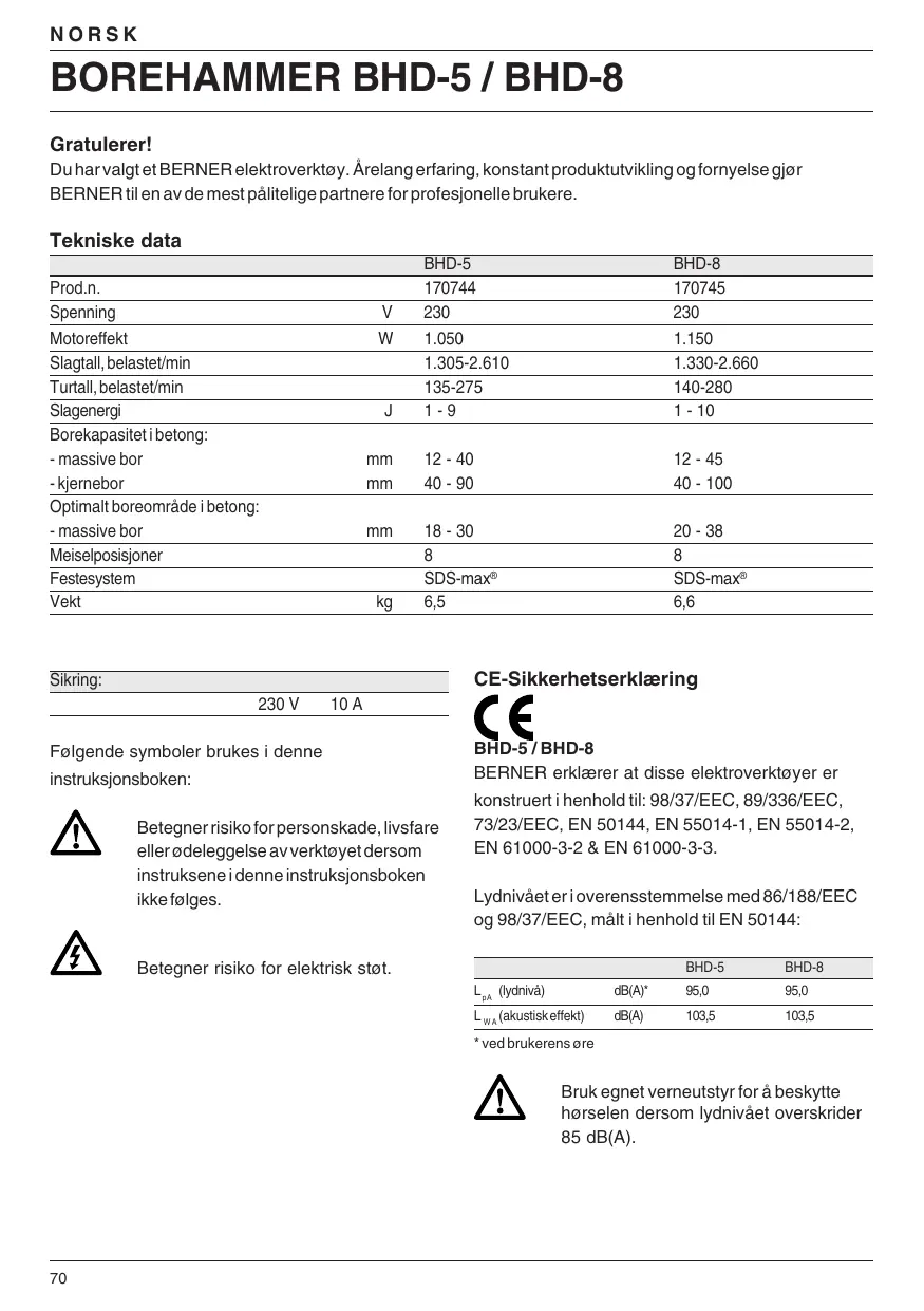NORSK BOREHAMMER BHD-5 / BHD-8 Gratulerer! Du har valgt et BERNER elektroverktøy. Årelang erfaring, konstant produktutvikling og fornyelse gjør BERNER til en av de mest pålitelige partnere for profesjonelle brukere.