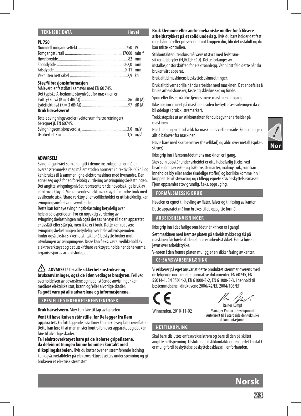 avvikende utskiftbare verktøy eller vedlikeholdet er utilstrekkelig, kan Høvelen er egnet til høvling av flater, falser og til fasing av kanter svingningsnivået være avvikende. Dette kan forhøye svingningsbelastning betydelig over Dette apparatet må kun brukes til de oppgitte formål. hele arbeidsperioden. For en nøyaktig vurdering av ARBEIDSHENVISNINGER svingningsbelastningen må også det tas hensyn til tiden apparatet er avslått eller står på, men ikke er i bruk. Dette kan redusere Ikke grip inn i det farlige området når kniven er i gang! svingningsbelastningen betydelig over hele arbeidsperioden. Sett maskinen med fremste platen på arbeidsstykket og slå på Innfør også ekstra sikkerhetstiltak for å beskytte bruker mot maskinen før høvlebladene berører arbeidsstykket. Før så høvelen utvirkingen av svingningene. Disse kan f.eks. være: vedlikehold av elektroverktøyet og det utskiftbare verktøyet, holde hendene varme, jevnt over arbeidstykke. V-noten i den fremre platen muliggjør en sikker fasing av kanter. organisasjon av arbeidsforløpet. CE-SAMSVARSERKLÆRING TEKNISKE DATA Høvel ADVARSEL! Les alle sikkerhetsinstrukser og bruksanvisninger, også de i den vedlagte brosjyren. Feil ved overholdelsen av advarslene og nedenstående anvisninger kan medføre elektriske støt, brann og/eller alvorlige skader. Ta godt vare på alle advarslene og informasjonene. Vi erklærer på eget ansvar at dette produktet stemmer overens med de følgende normer eller normative dokumenter. EN 60745, EN 55014-1, EN 55014-2, EN 61000-3-2, EN 61000-3-3, i henhold til bestemmelsene i direktivene 2006/42/EF, 2004/108/EF SPESIELLE SIKKERHETSHENVISNINGER Bruk hørselsvern. Støy kan føre til tap av hørselen Vent til høvelkniven står stille, før De legger fra Dem apparatet. En frittliggende høvelkniv kan hekte seg fast i overflaten. Dette kan føre til at man mister kontrollen over apparatet og det kan føre til alvorlige skader. Ta i elektroverktøyet bare på de isolerte gripeflatene, da deleinnretningen kunne komme i kontakt med tilkoplingskabelen. Hvis du kutter over en strømførende ledning kan også metalldeler på elektroverktøyet settes under spenning og gi brukeren et elektrisk strømstøt. Winnenden, 2010-11-02 Rainer Kumpf Manager Product Development Autorisert til å utarbeide den tekniske dokumentasjonen NETTILKOPLING Skal bare tilsluttes enfasevekselstrøm og bare til den på skiltet angitte nettspenning. Tilslutning til stikkontakter uten jordet kontakt er mulig fordi beskyttelse beskyttelsesklasse II er forhanden. Norsk