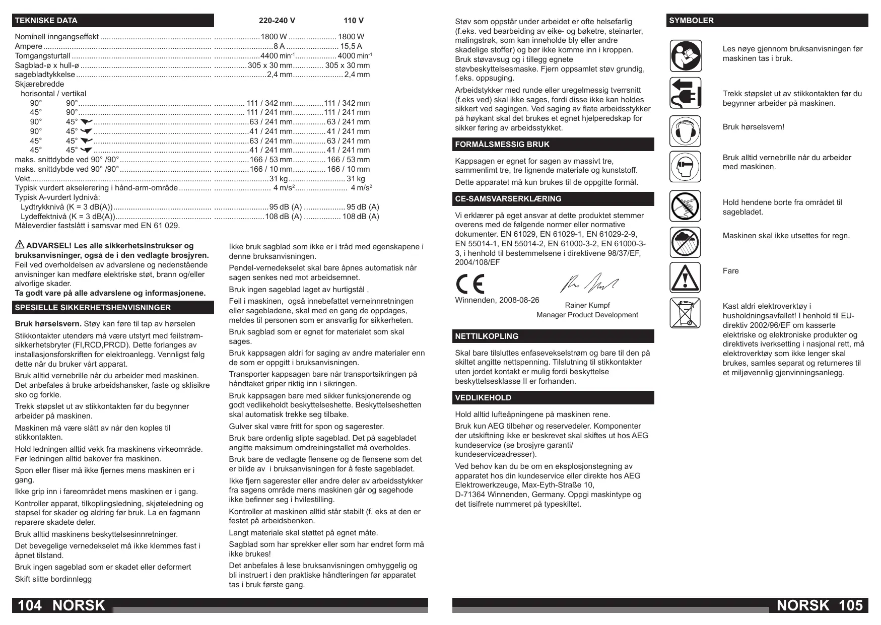 Kappsagen er egnet for sagen av massivt tre, sammenlimt tre, tre lignende materiale og kunststoff. Bruk alltid vernebrille når du arbeider med maskinen. Dette apparatet må kun brukes til de oppgitte formål. CE-SAMSVARSERKLÆRING Vi erklærer på eget ansvar at dette produktet stemmer overens med de følgende normer eller normative dokumenter. EN 61029, EN 61029-1, EN 61029-2-9, EN 55014-1, EN 55014-2, EN 61000-3-2, EN 61000-33, i henhold til bestemmelsene i direktivene 98/37/EF, 2004/108/EF Hold hendene borte fra området til sagebladet. Maskinen skal ikke utsettes for regn. Fare Bruk ingen sageblad laget av hurtigstål . Feil i maskinen, også innebefattet verneinnretningen eller sagebladene, skal med en gang de oppdages, meldes til personen som er ansvarlig for sikkerheten. Bruk sagblad som er egnet for materialet som skal sages. Bruk kappsagen aldri for saging av andre materialer enn de som er oppgitt i bruksanvisningen. Transporter kappsagen bare når transportsikringen på håndtaket griper riktig inn i sikringen. Winnenden, 2008-08-26 Rainer Kumpf Manager Product Development NETTILKOPLING Skal bare tilsluttes enfasevekselstrøm og bare til den på skiltet angitte nettspenning. Tilslutning til stikkontakter uten jordet kontakt er mulig fordi beskyttelse beskyttelsesklasse II er forhanden. Bruk kappsagen bare med sikker funksjonerende og godt vedlikeholdt beskyttelseshette. Beskyttelseshetten skal automatisk trekke seg tilbake. VEDLIKEHOLD Gulver skal være fritt for spon og sagerester. Bruk kun AEG tilbehør og reservedeler. Komponenter der utskiftning ikke er beskrevet skal skiftes ut hos AEG kundeservice (se brosjyre garanti/ kundeserviceadresser). Bruk bare ordenlig slipte sageblad. Det på sagebladet angitte maksimum omdreiningstallet må overholdes. Bruk bare de vedlagte flensene og de flensene som det er bilde av i bruksanvisningen for å feste sagebladet. Ikke fjern sagerester eller andre deler av arbeidsstykker fra sagens område mens maskinen går og sagehode ikke befinner seg i hvilestilling. Kontroller at maskinen alltid står stabilt (f. eks at den er festet på arbeidsbenken. Kast aldri elektroverktøy i husholdningsavfallet! I henhold til EUdirektiv 2002/96/EF om kasserte elektriske og elektroniske produkter og direktivets iverksetting i nasjonal rett, må elektroverktøy som ikke lenger skal brukes, samles separat og returneres til et miljøvennlig gjenvinningsanlegg. Hold alltid lufteåpningene på maskinen rene. Ved behov kan du be om en eksplosjonstegning av apparatet hos din kundeservice eller direkte hos AEG Elektrowerkzeuge, Max‑Eyth‑Straße 10, D‑71364 Winnenden, Germany. Oppgi maskintype og det tisifrete nummeret på typeskiltet. Langt materiale skal støttet på egnet måte. Sagblad som har sprekker eller som har endret form må ikke brukes! Det anbefales å lese bruksanvisningen omhyggelig og bli instruert i den praktiske håndteringen før apparatet tas i bruk første gang. NORSK 105 (høyre) BESKRIVELSE BESKRIVELSE